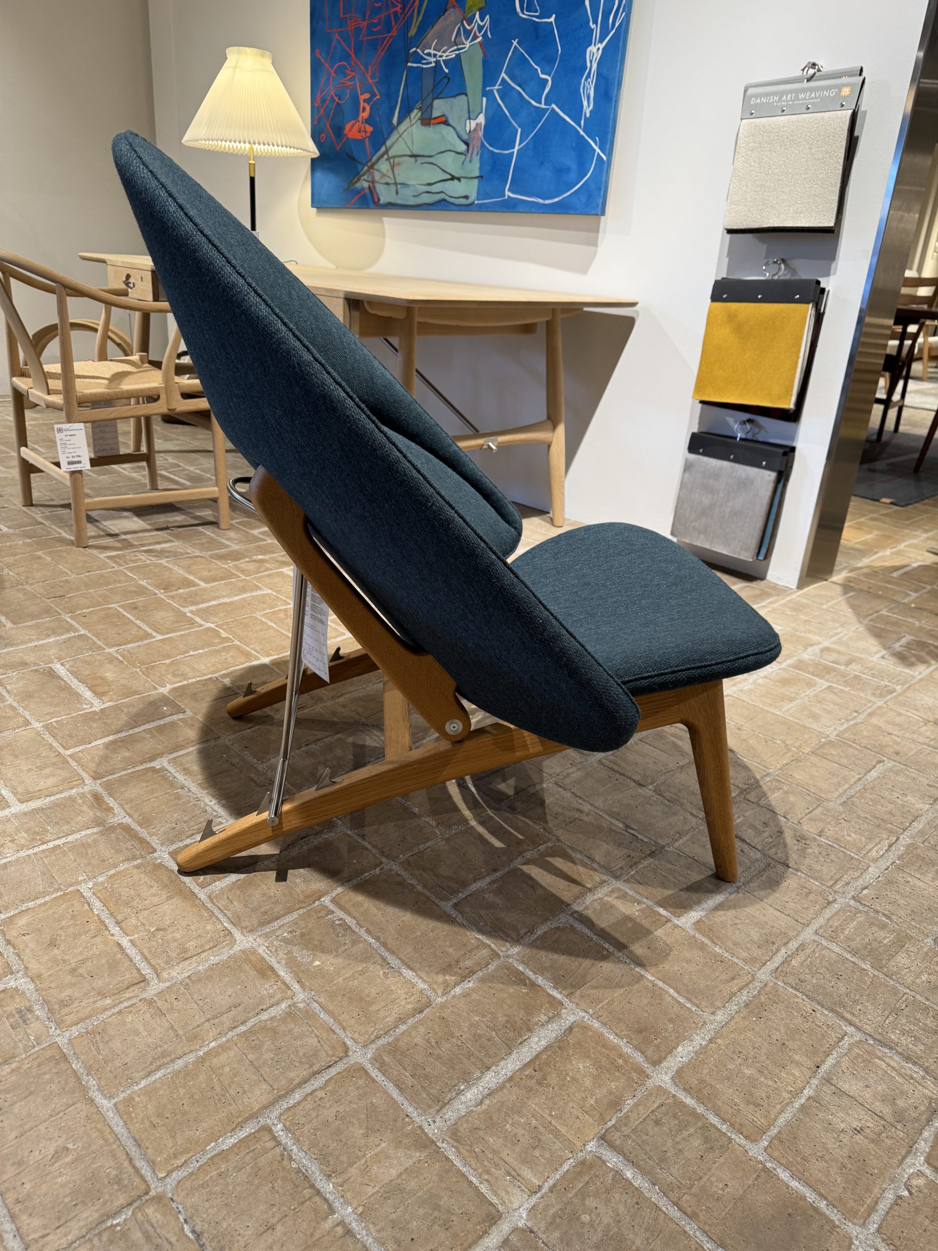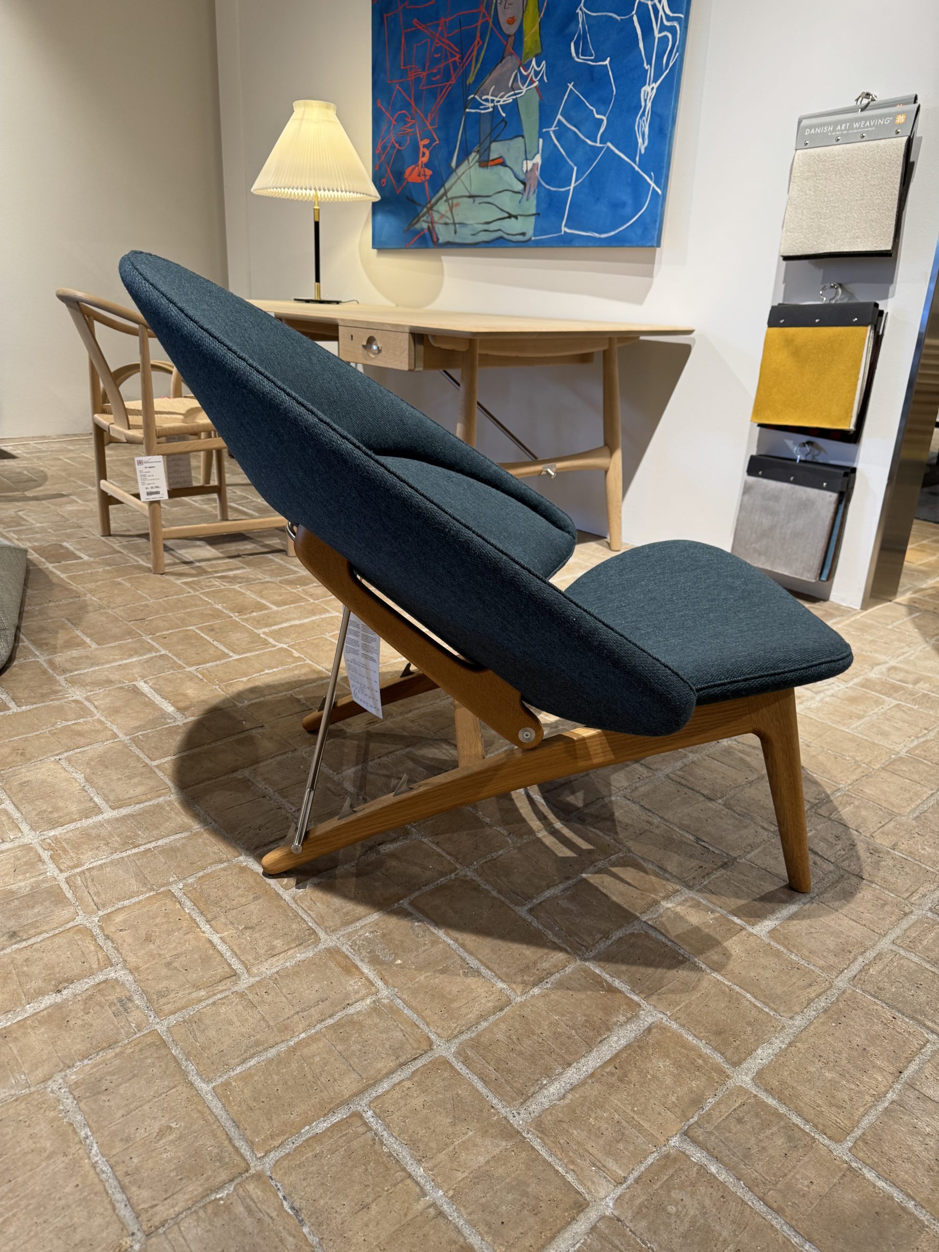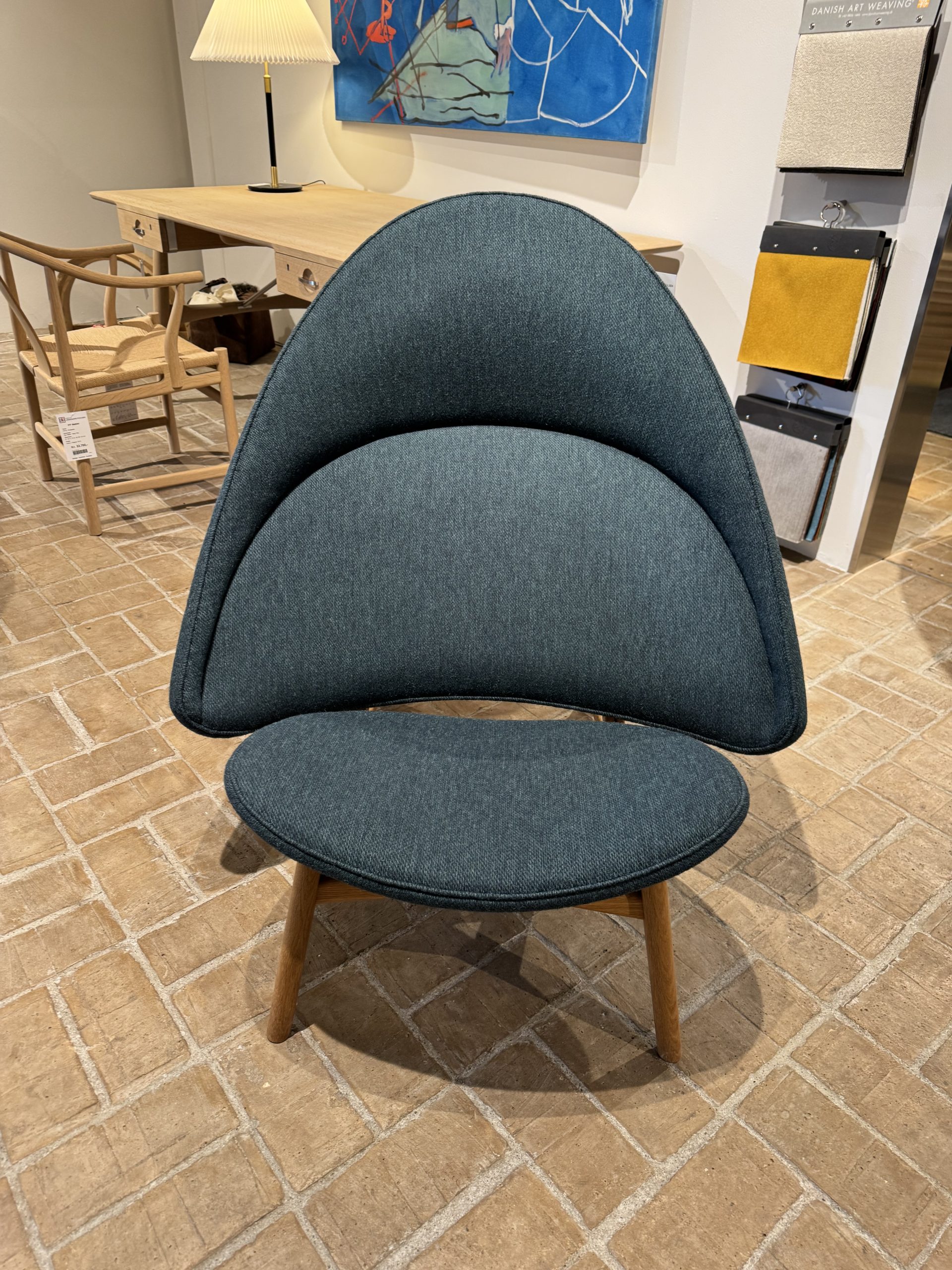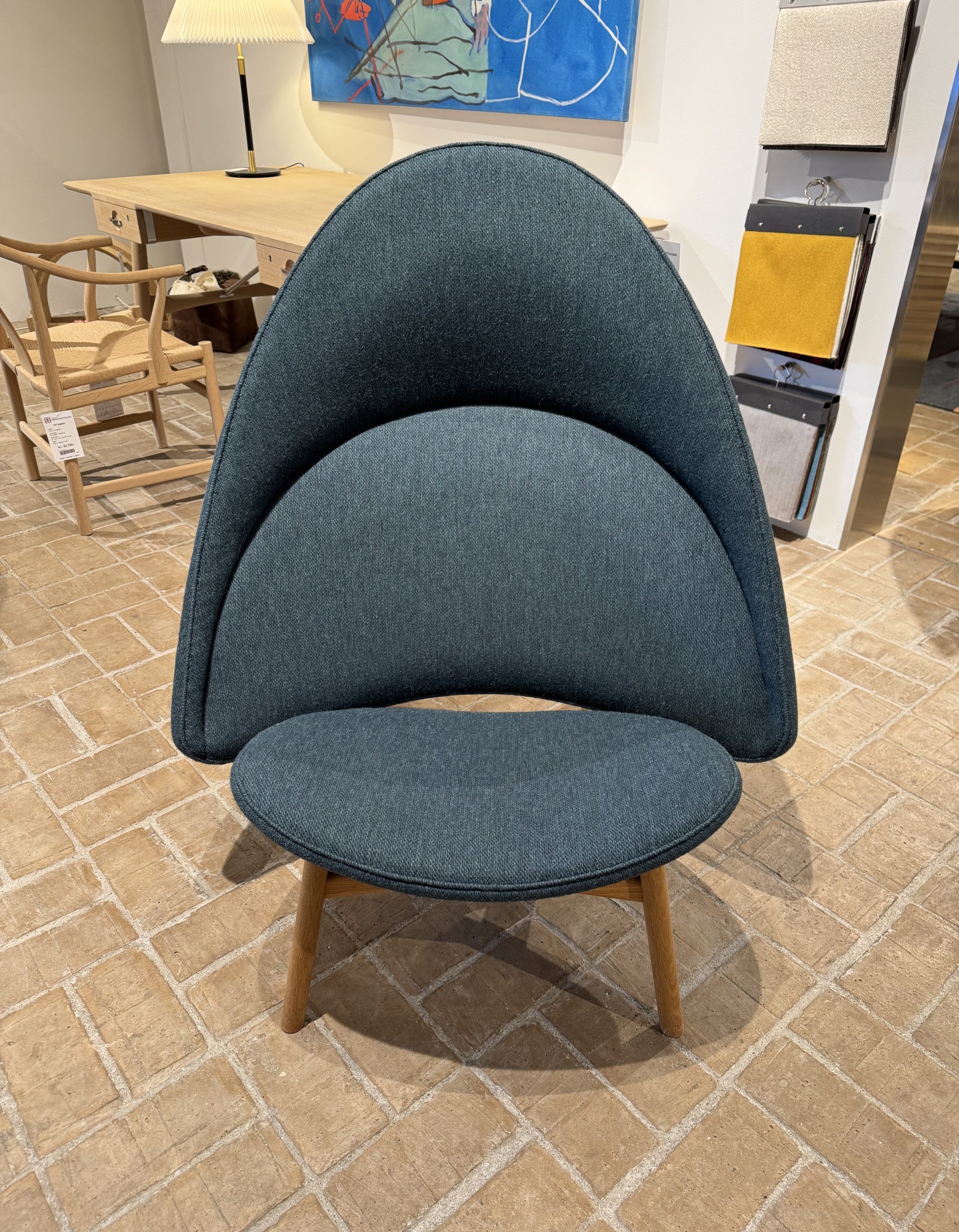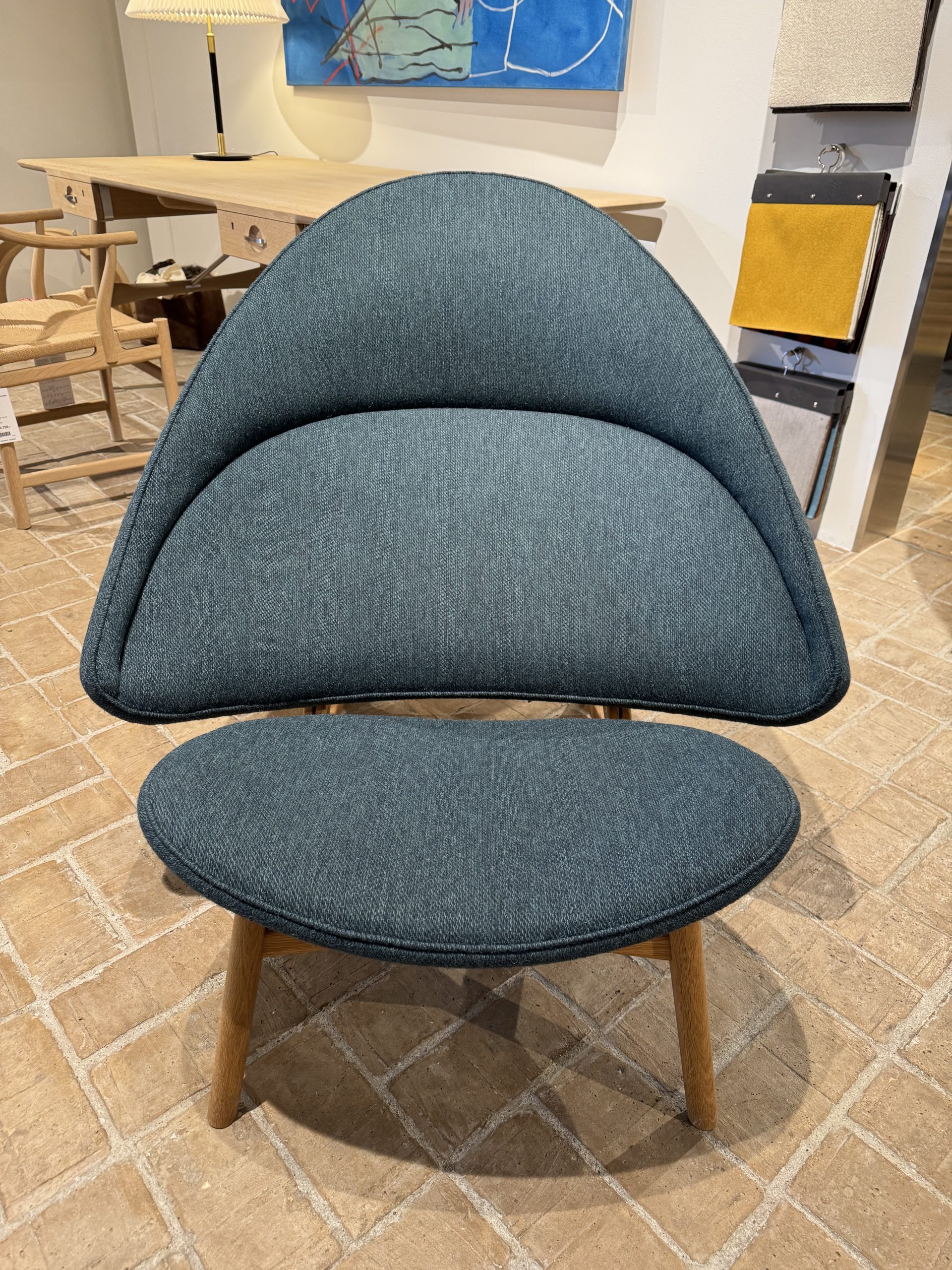 Denne udstillingsmodel er udført i olieret eg og betrukket med Colur-stof, som understreger stolens bløde, organiske udtryk.