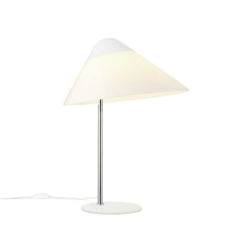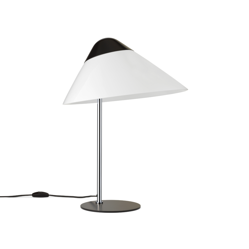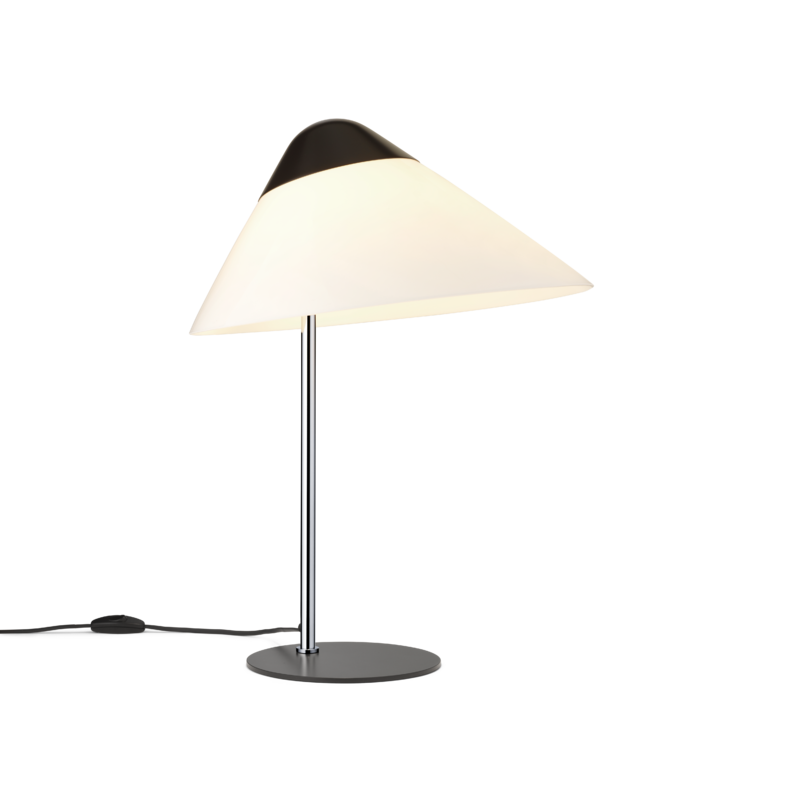Bordlampen har en asymmetrisk skærm i opal akryl, som kombineres med en malet aluminiumsplade. Resultatet er et behageligt og retningsbestemt lys, perfekt til læsning eller arbejdslys, mens selve skærmen samtidig spreder en blød, stemningsfuld belysning til rummet omkring.