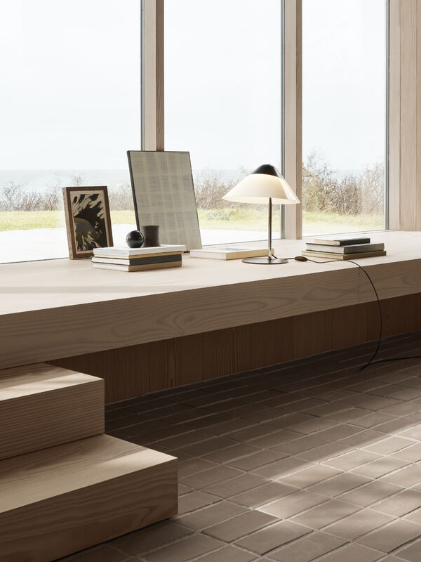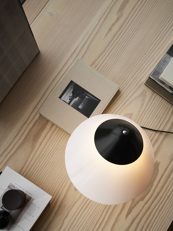 Opala Midi fås i to varianter – sort top og fod eller hvid top og fod – så den kan tilpasses både klassiske og moderne interiører. Lampens skulpturelle form gør den lige velegnet på skrivebordet, i stuen eller som et markant designelement i entréen.