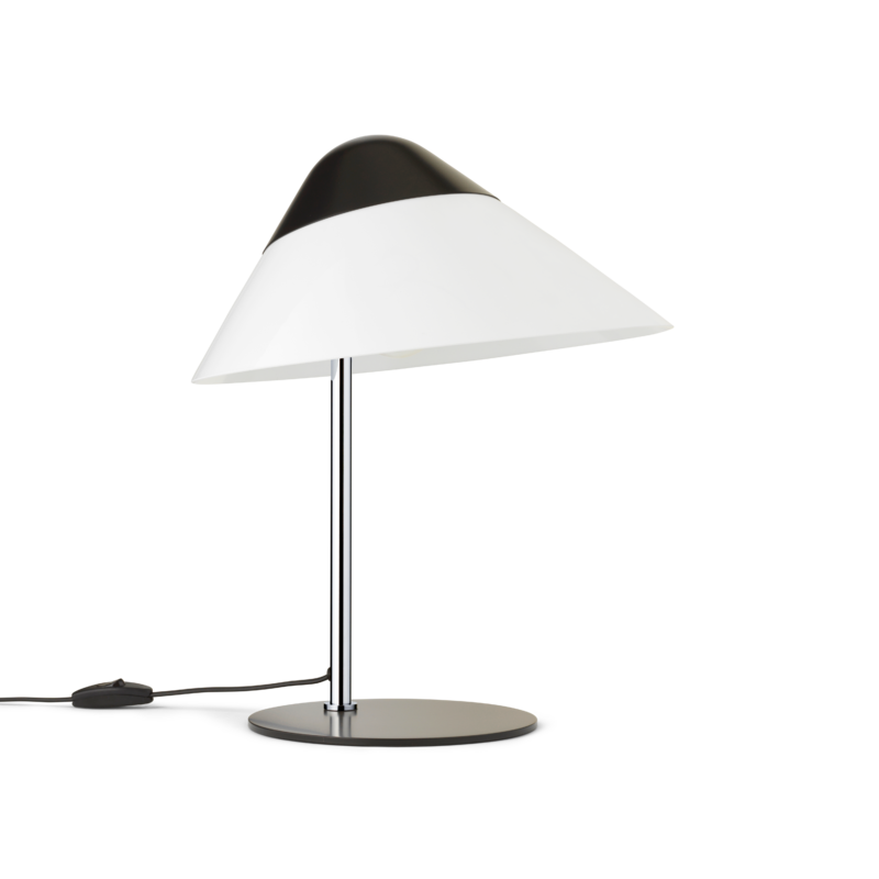 Opala Meni fås i to varianter – sort top og fod eller hvid top og fod – så den kan tilpasses både klassiske og moderne interiører. Lampens skulpturelle form gør den lige velegnet på skrivebordet, i stuen eller som et markant designelement i entréen.