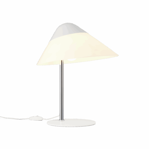 Bordlampen har en asymmetrisk skærm i opal akryl, som kombineres med en malet aluminiumsplade. Resultatet er et behageligt og retningsbestemt lys, perfekt til læsning eller arbejdslys, mens selve skærmen samtidig spreder en blød, stemningsfuld belysning til rummet omkring.