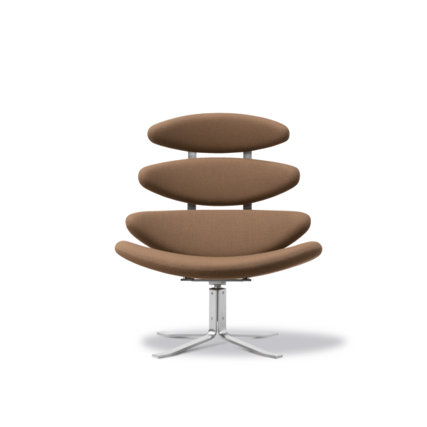 Corona-stolen designet af Poul M. Volther i 1964, er et unikt og eksperimenterende designikon inden for dansk møbelkunst. Den er kendt for sin karakteristiske silhuet med ellipseformede, polstrede sædepuder, der gradvist øges i størrelse fra top til bund. Stolen har et drejeligt stel og en fleksibel ryg, hvilket gør den meget komfortabel og velegnet både til private hjem og til offentlige miljøer som lobbyer og kontorer. Navnet “Corona” menes at være inspireret af time-lapse-billeder af en solformørkelse og dens korona – den ydre del af Solens atmosfære.