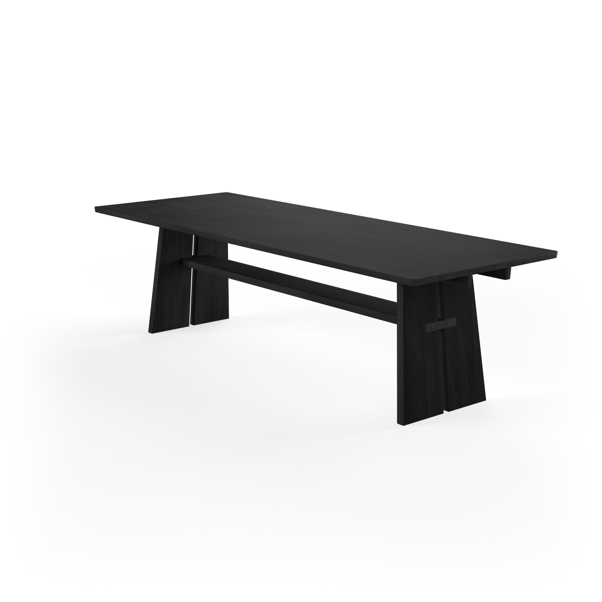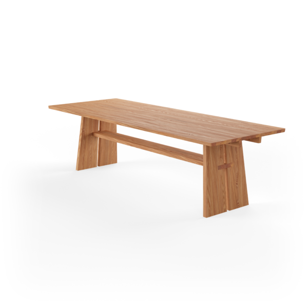 Gehl bordet eksperimenterer med vinkler for at skabe et særligt samspil mellem træets naturlige æstetik og et unikt formsprog. Bordpladens bløde rundinger, kombineret med en fasede kant, tilføjer en lethed til det ellers stramme design. Den synlige længdesarg, elegant integreret med bordkanten, løfter bordpladen visuelt fra benene og giver bordet både karakter og spænding. Understellet er samlet med et massivt tværstykke, hvilket skaber en markant og moderne profil i designet.