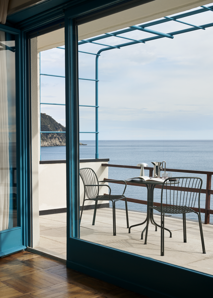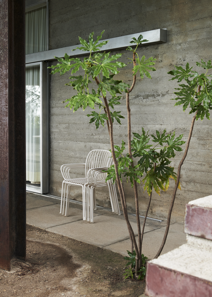 Stolen er udført i stål, hvor det slanke stel står i kontrast til det lette sæde og ryg i gitterstruktur. Denne kombination giver stolen et luftigt udtryk og gør den behagelig at sidde i – samtidig med at den fremstår robust og holdbar til udendørs brug.