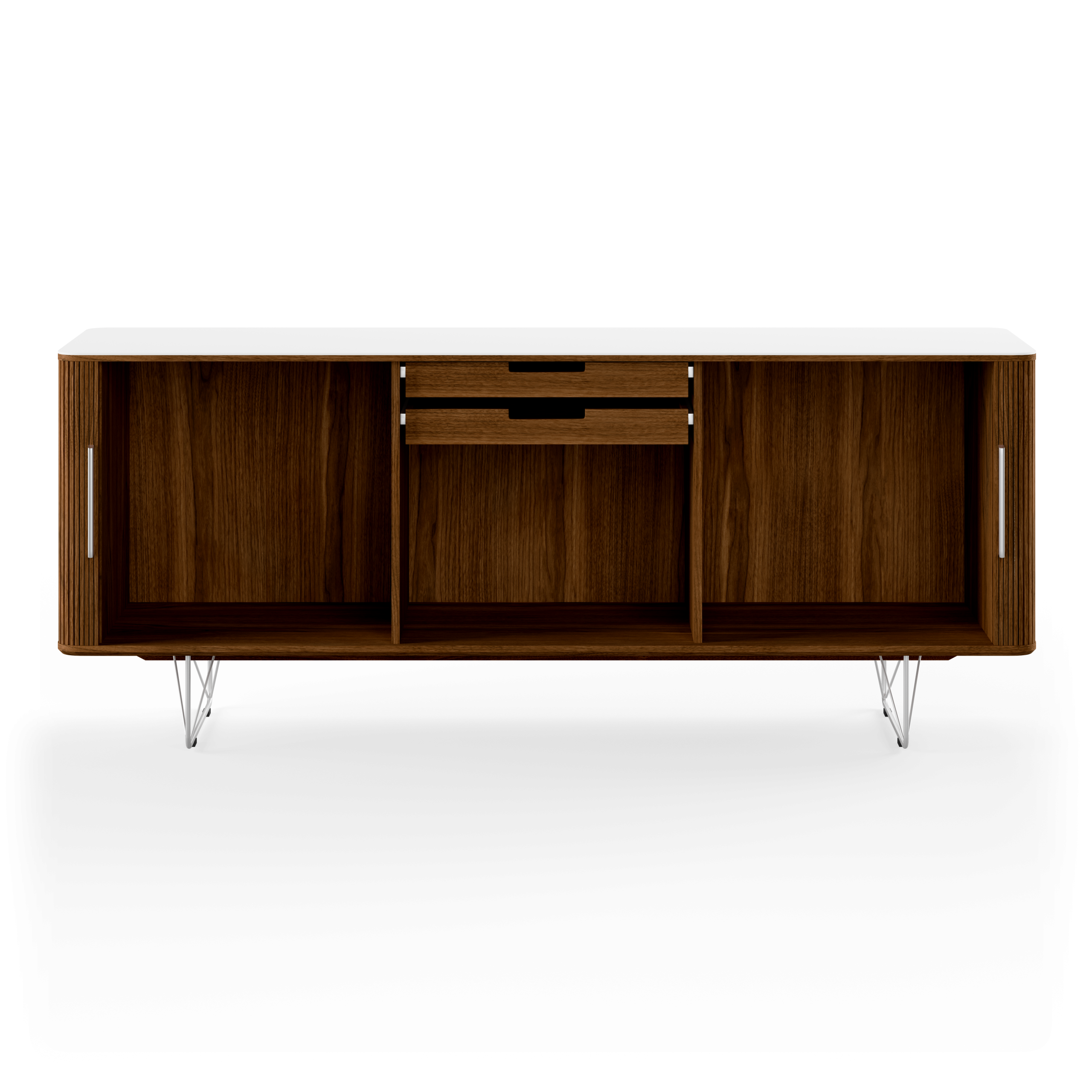 Skænken AK 2730 med stålunderstel og AK 2732 med Point understel har en elegant form og smukke jalousilåger, der omfavner korpuset og understøttes af et let stålunderstel.