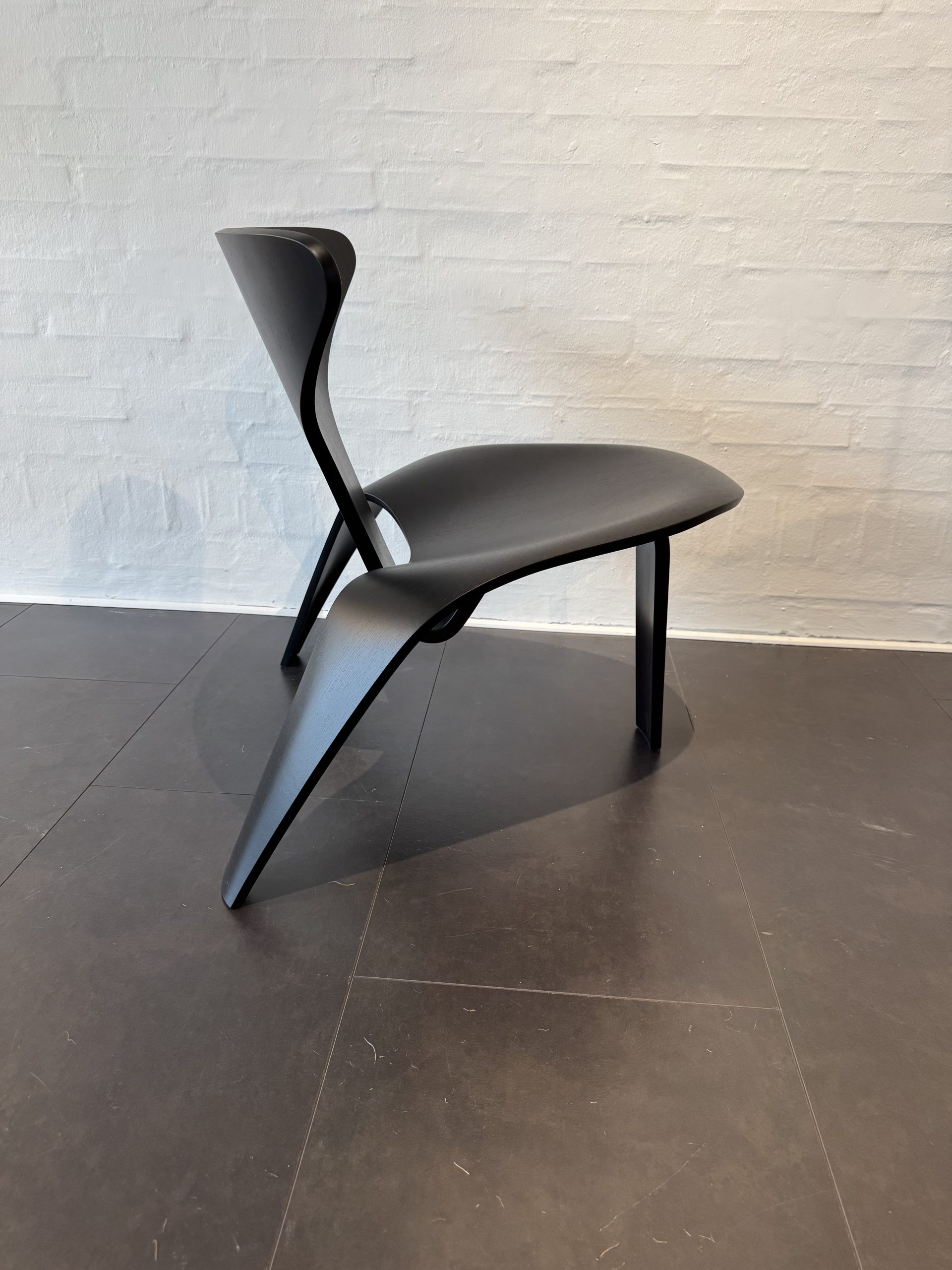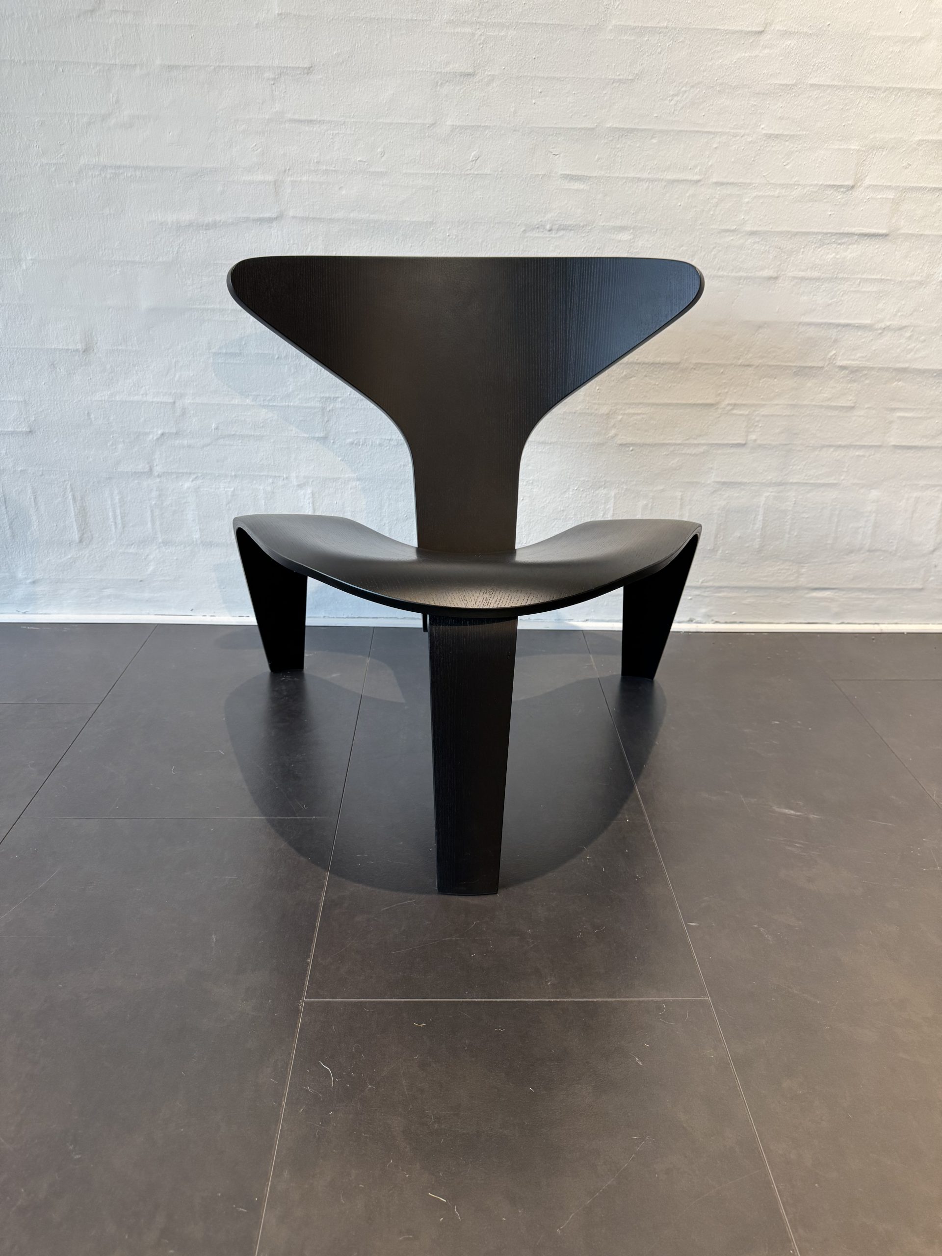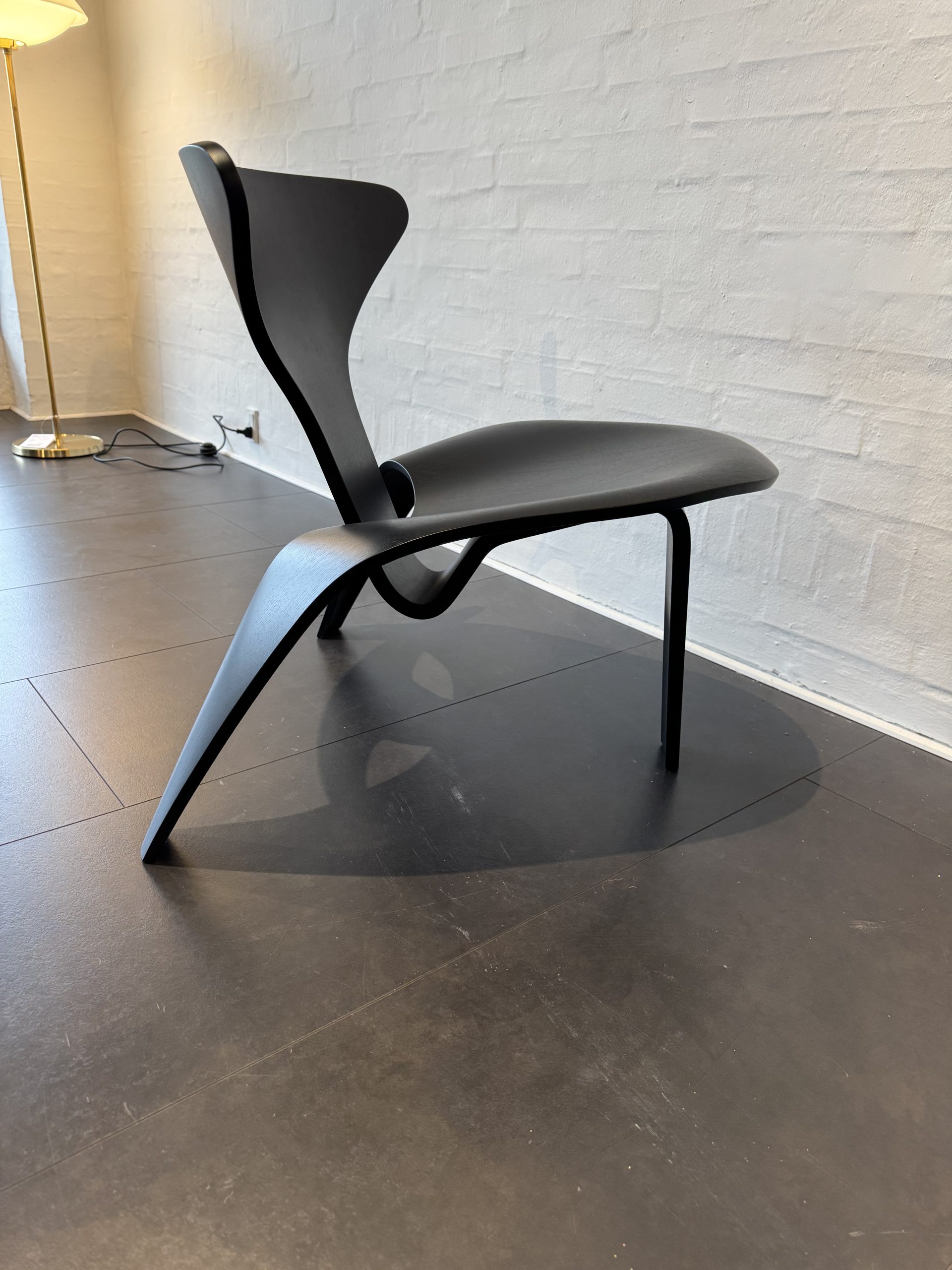 Denne udstillingsmodel er udført i farvet finer / ask – sort med de karakteristiske cinnoberrøde afstandsklodser, som fremhæver stolens elegante, grafiske udtryk. Den organiske skalform sikrer samtidig overraskende god siddekomfort, og stolen fungerer perfekt som et designstatement i stuen, entréen eller i et loungeområde.