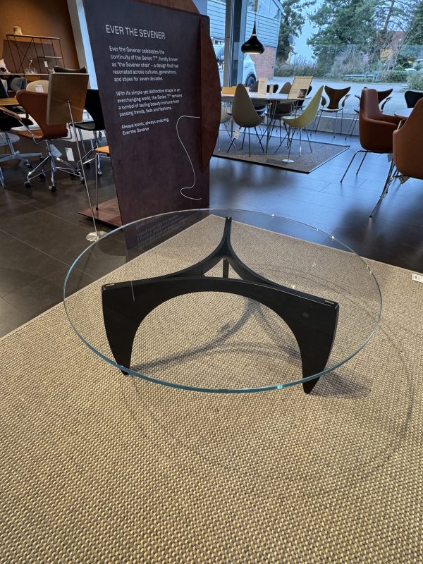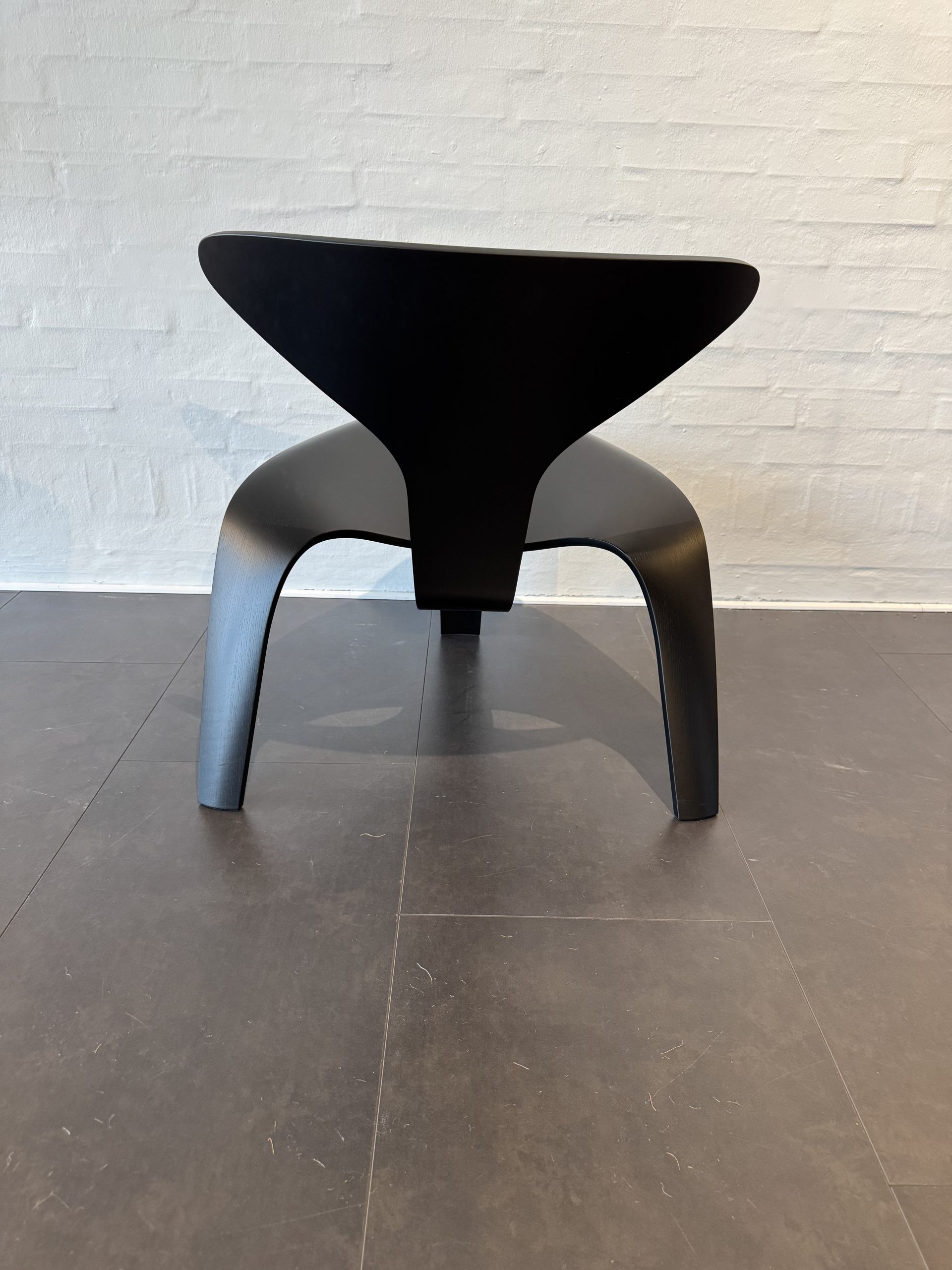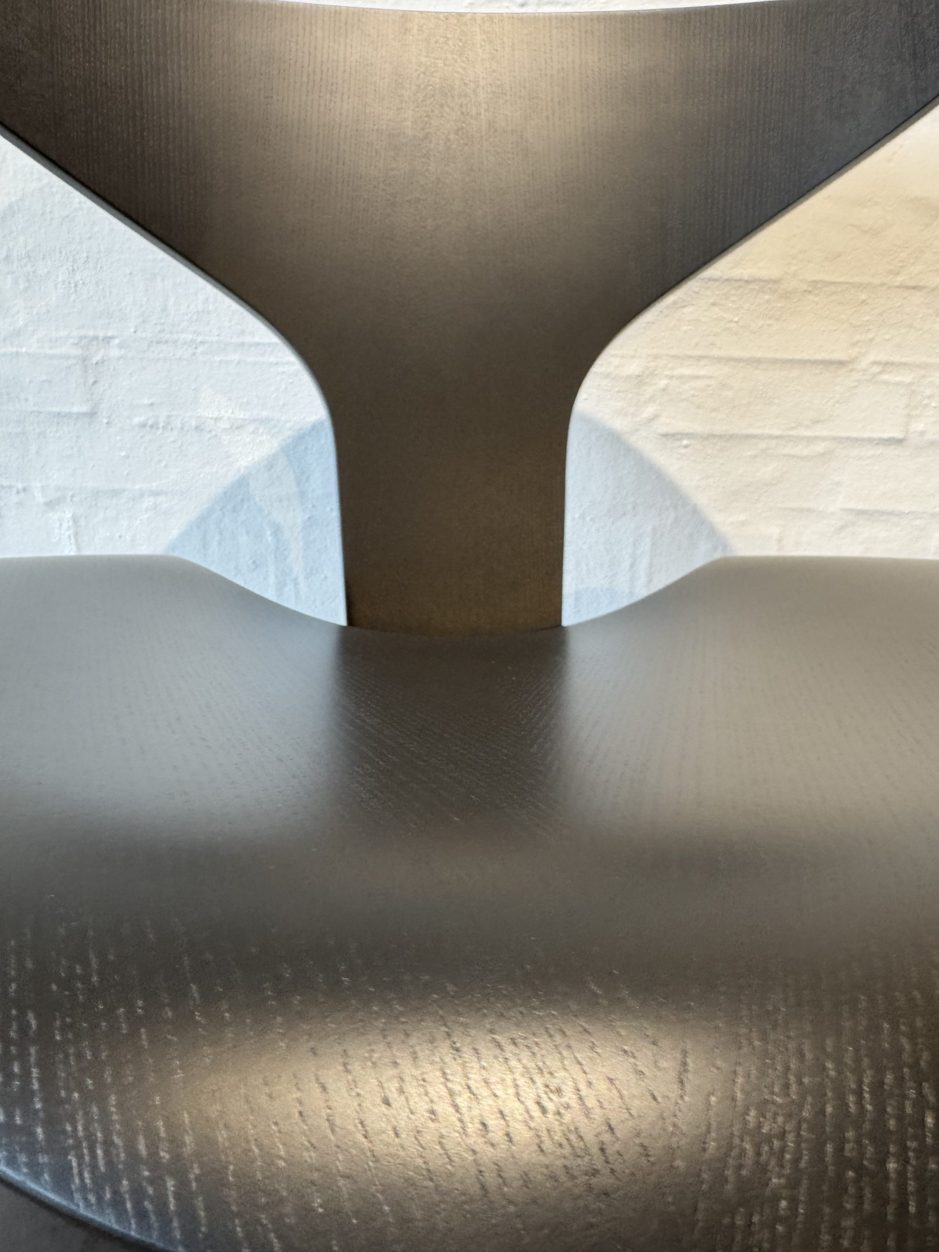 Denne udstillingsmodel er udført i farvet finer / ask – sort med de karakteristiske cinnoberrøde afstandsklodser, som fremhæver stolens elegante, grafiske udtryk. Den organiske skalform sikrer samtidig overraskende god siddekomfort, og stolen fungerer perfekt som et designstatement i stuen, entréen eller i et loungeområde.