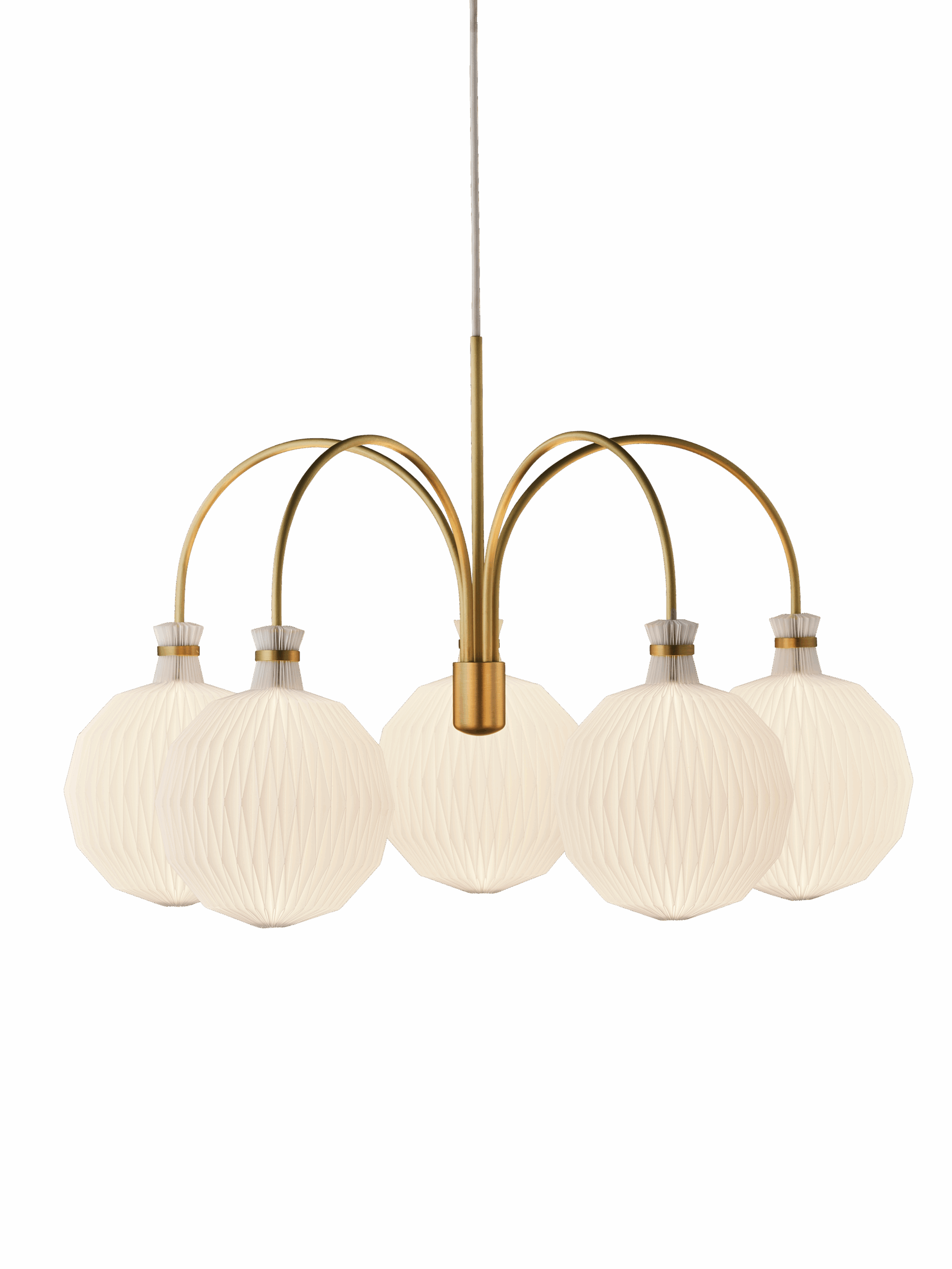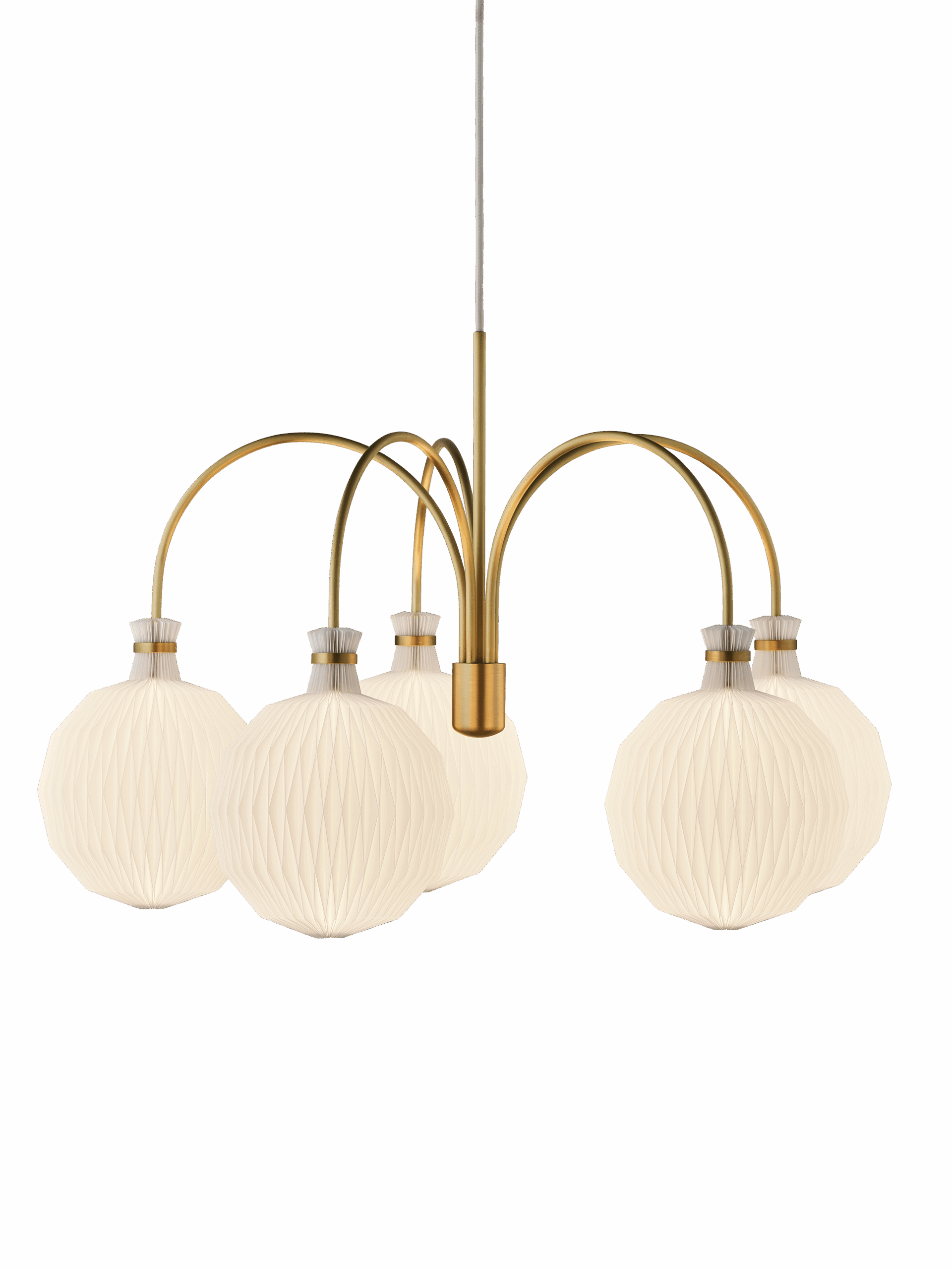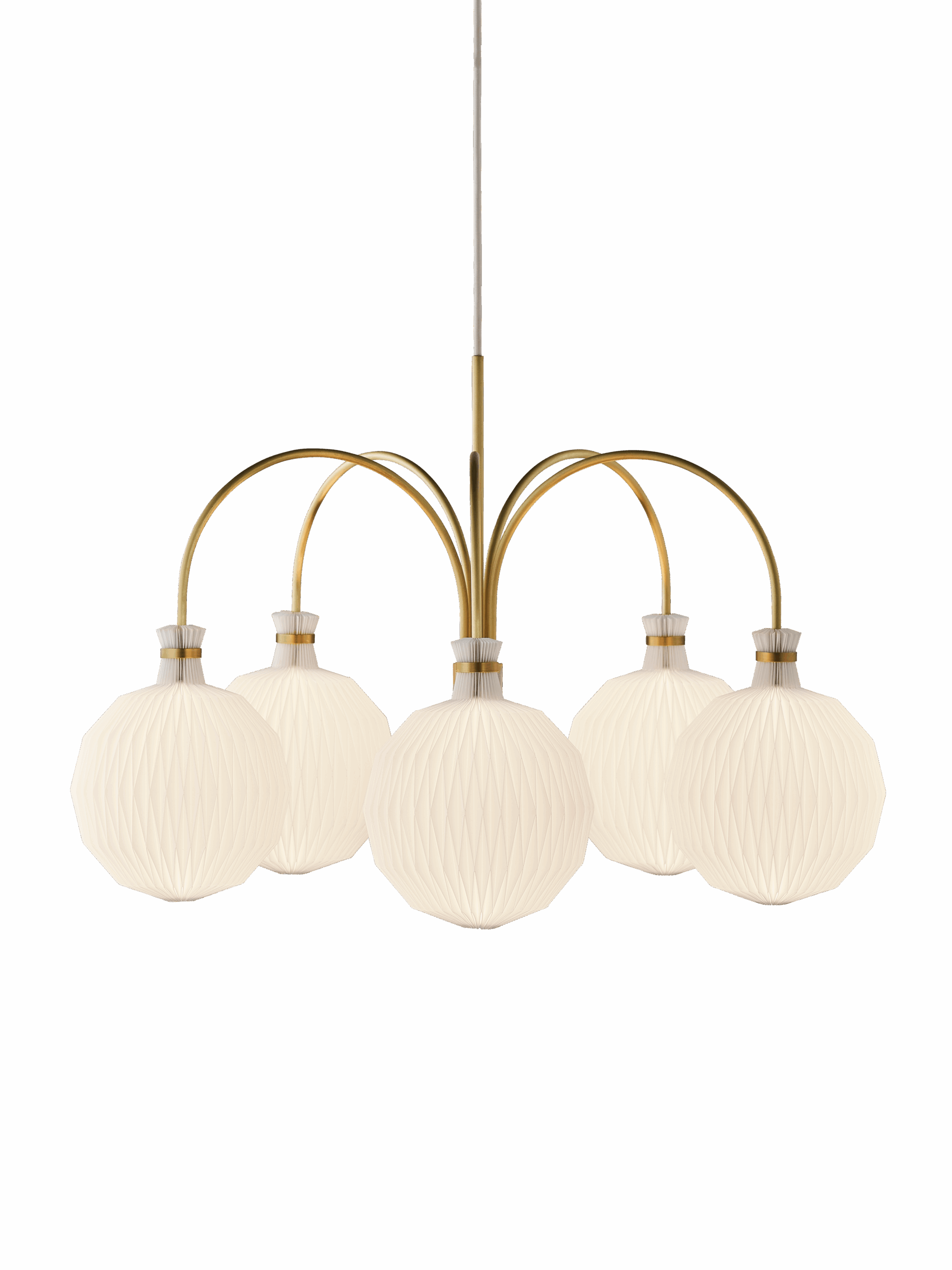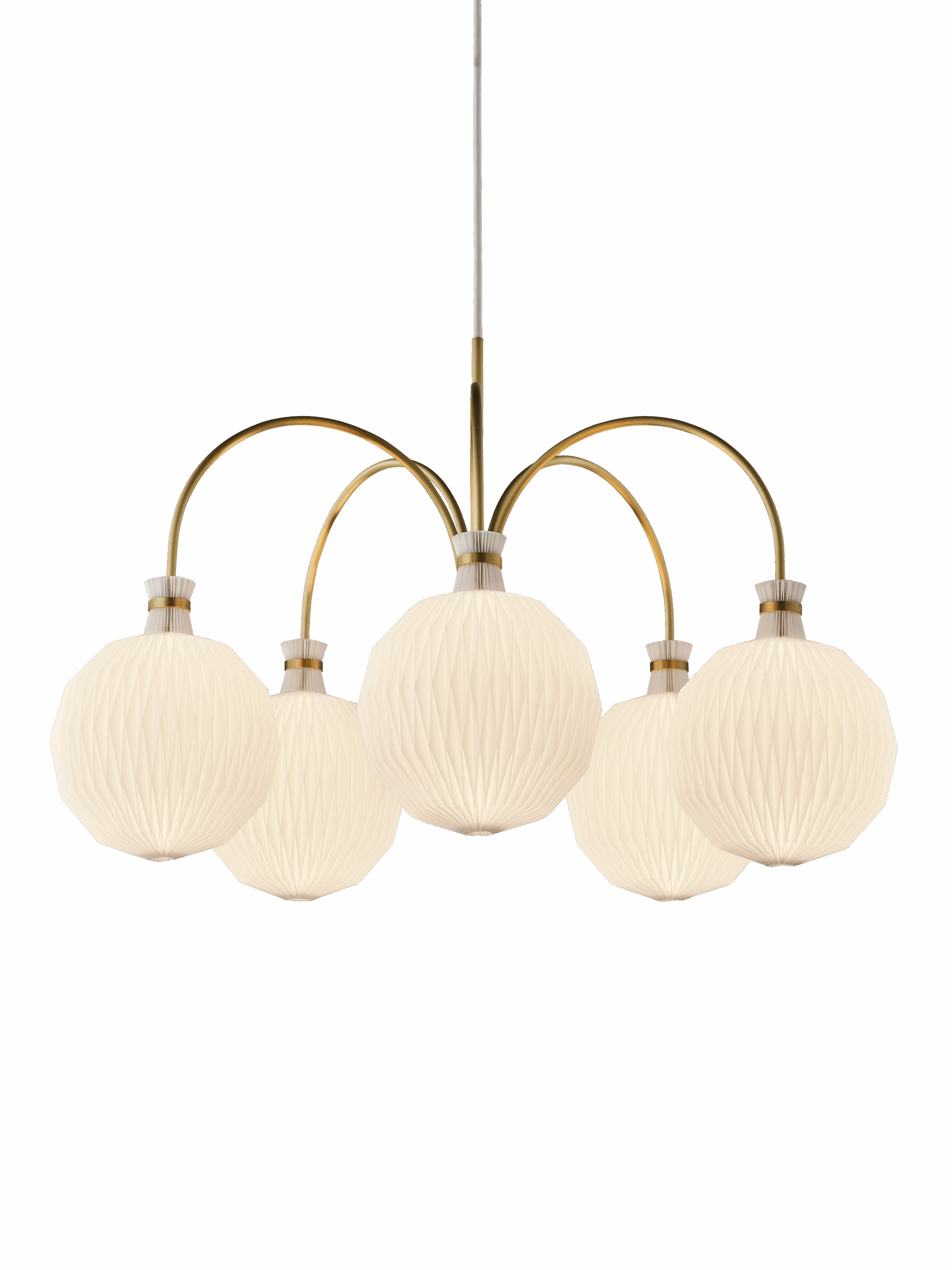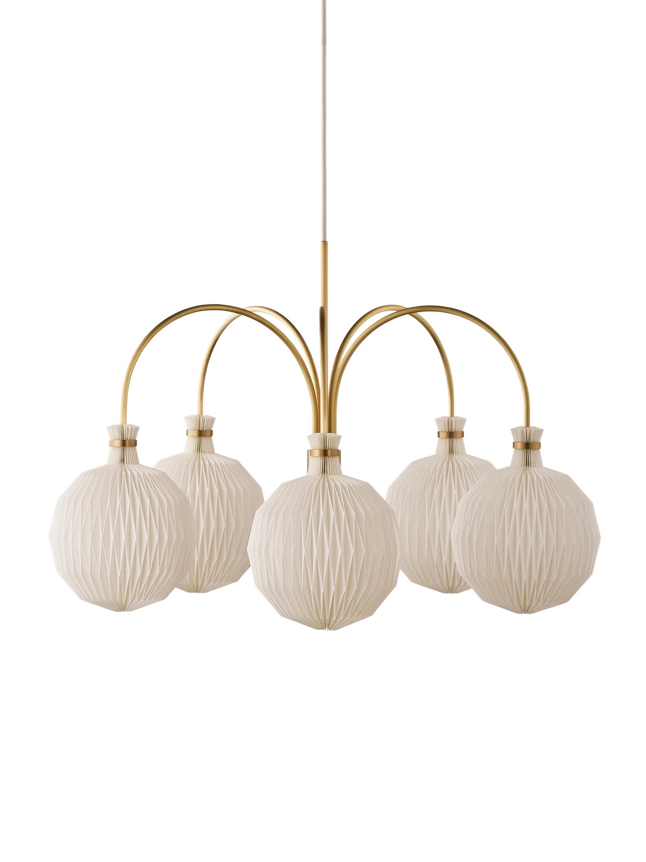 Model 101 Lysekrone fra Kaare Klint Legacy er et mesterværk i håndværk og formgivning. Lysekronen har fem buede messingarme, der mødes i et elegant, afrundet centrum og bærer de karakteristiske, håndfoldede lampeskærme – et symbol på klassisk dansk belysningskunst.