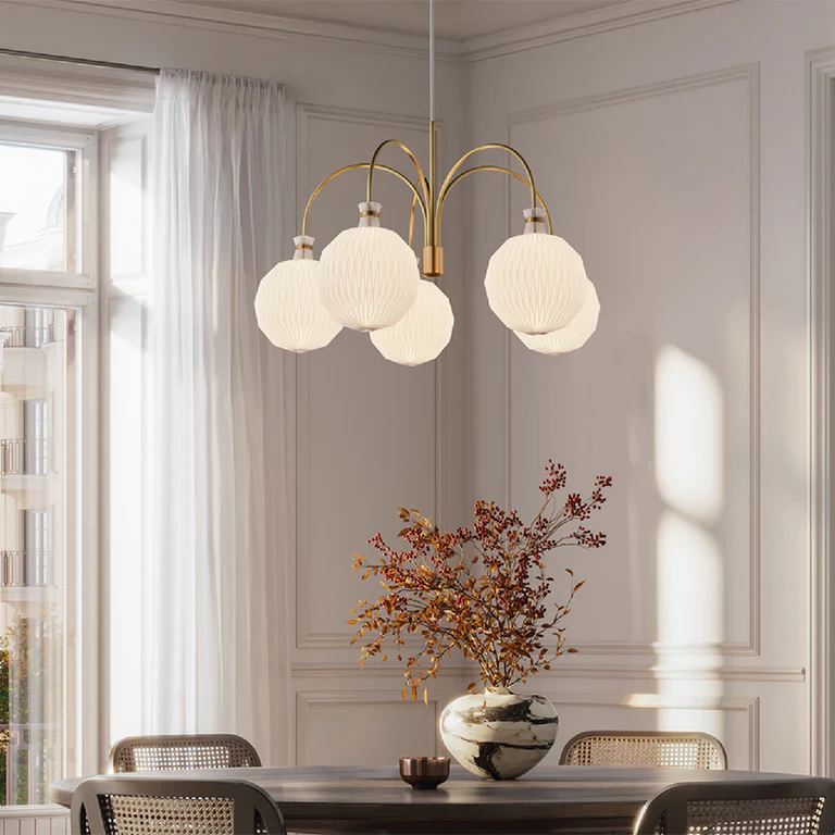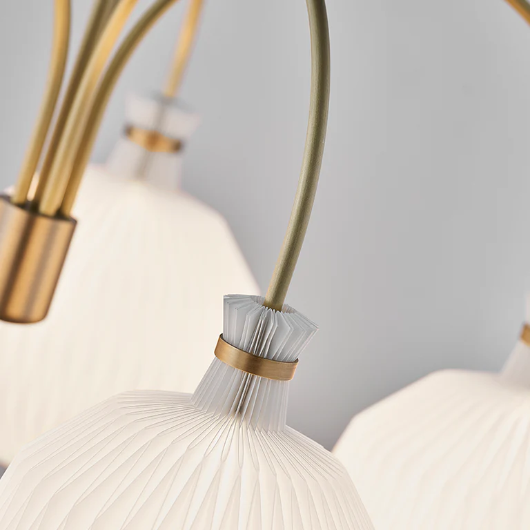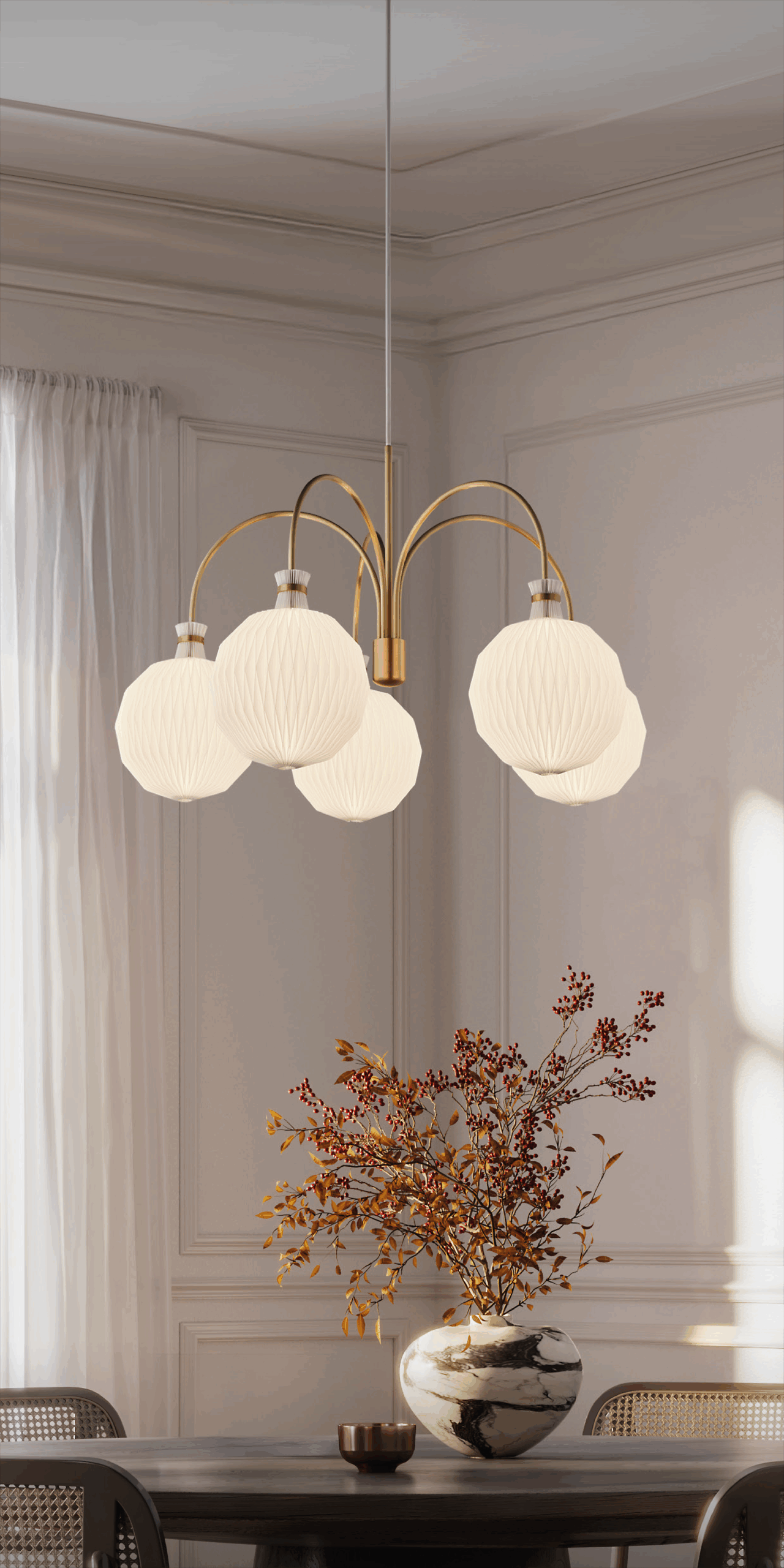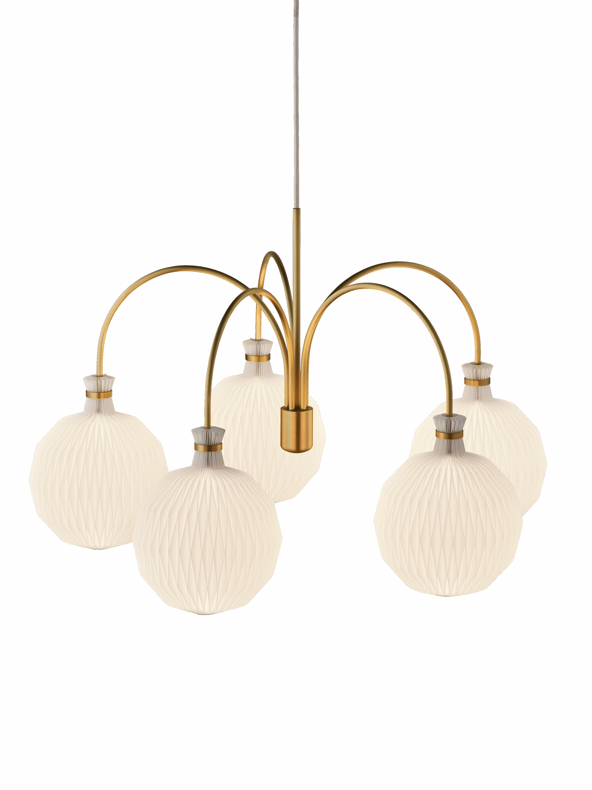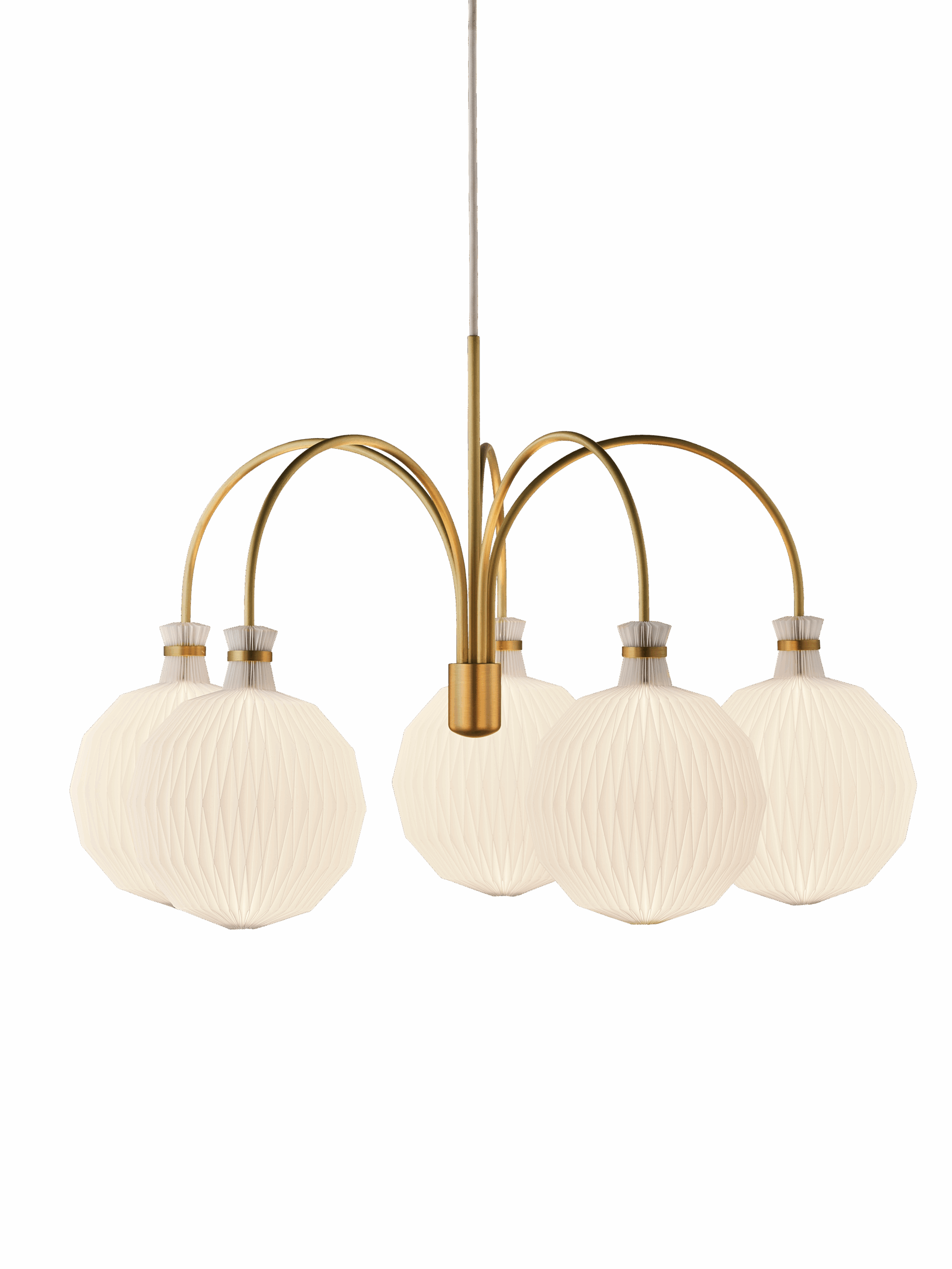 Model 101 Lysekrone fra Kaare Klint Legacy er et mesterværk i håndværk og formgivning. Lysekronen har fem buede messingarme, der mødes i et elegant, afrundet centrum og bærer de karakteristiske, håndfoldede lampeskærme – et symbol på klassisk dansk belysningskunst.