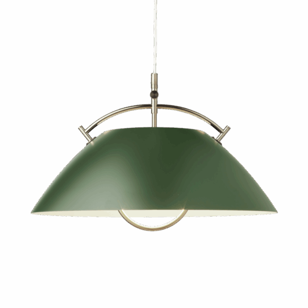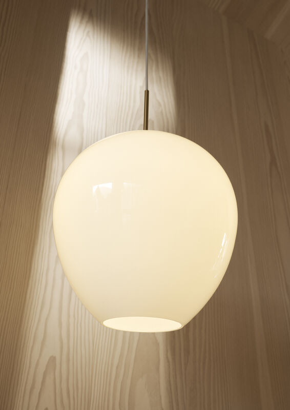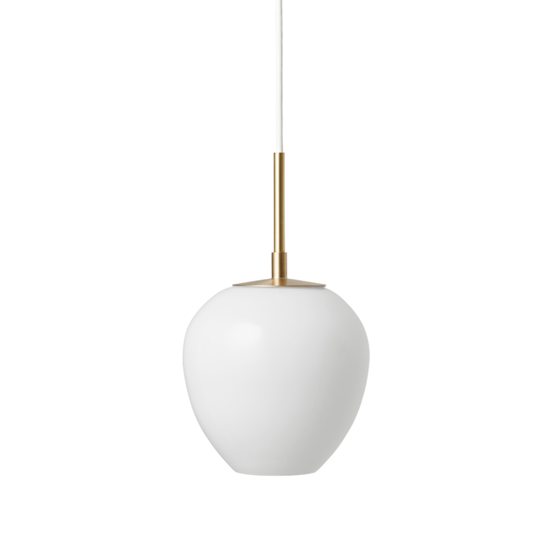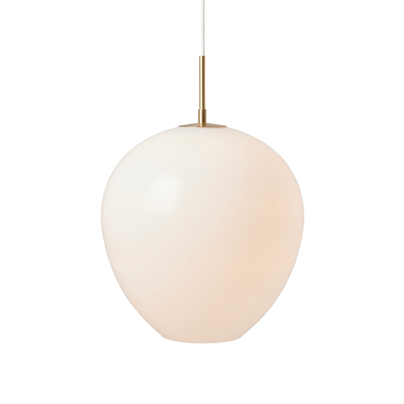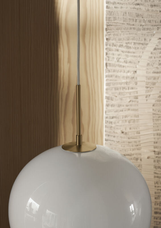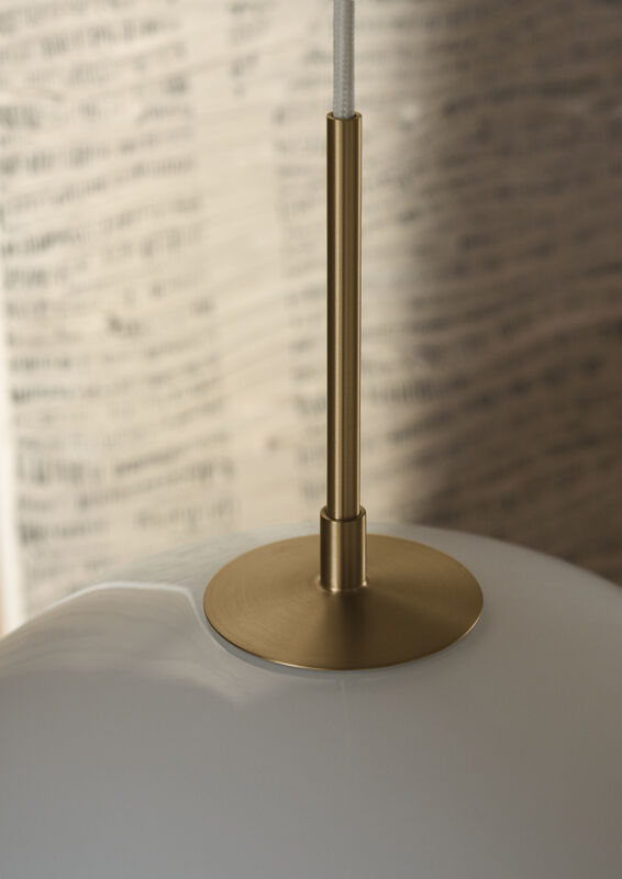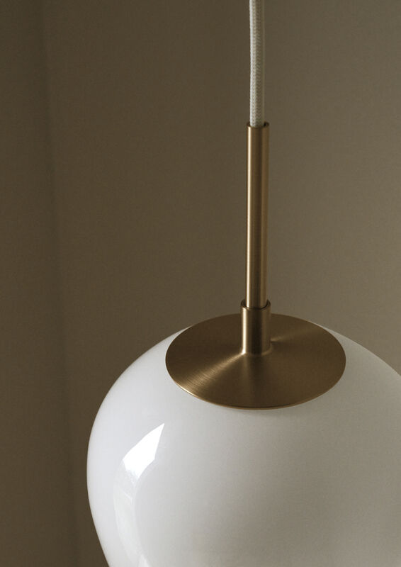 Ophænget i børstet messing tilfører varme og danner en harmonisk kontrast til det hvide glas, hvilket giver lampen en skulpturel og tidløs silhuet.