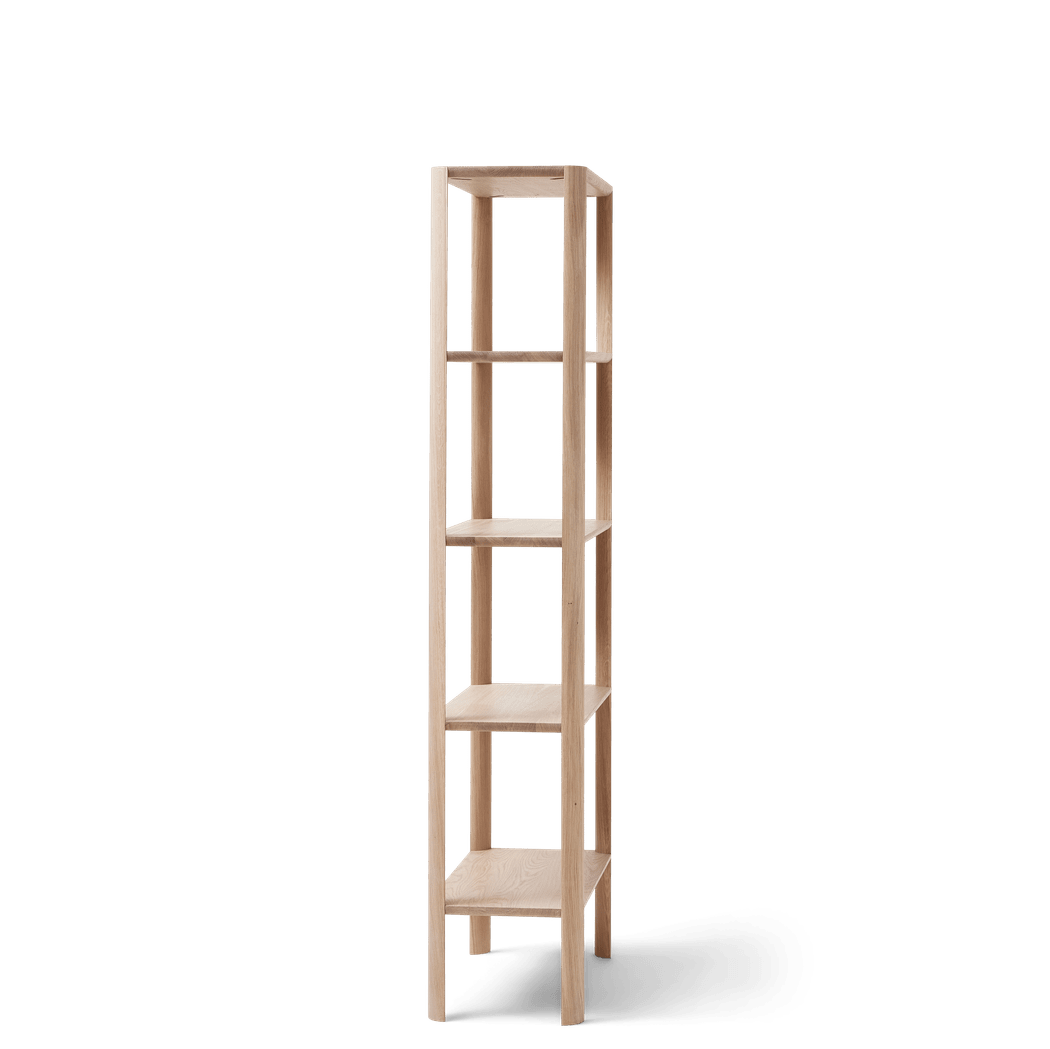Konstruktionen er helt uden synlige skruer eller ekstra stabiliserende dele, hvilket giver et rent, sammenhængende udtryk og en imponerende stabilitet. De fem hylder giver god plads til bøger, dekorationer og daglig opbevaring, mens den smalle bredde gør reolen ideel til både mindre rum eller som del af et større system.