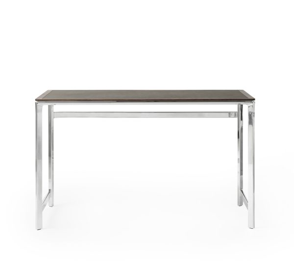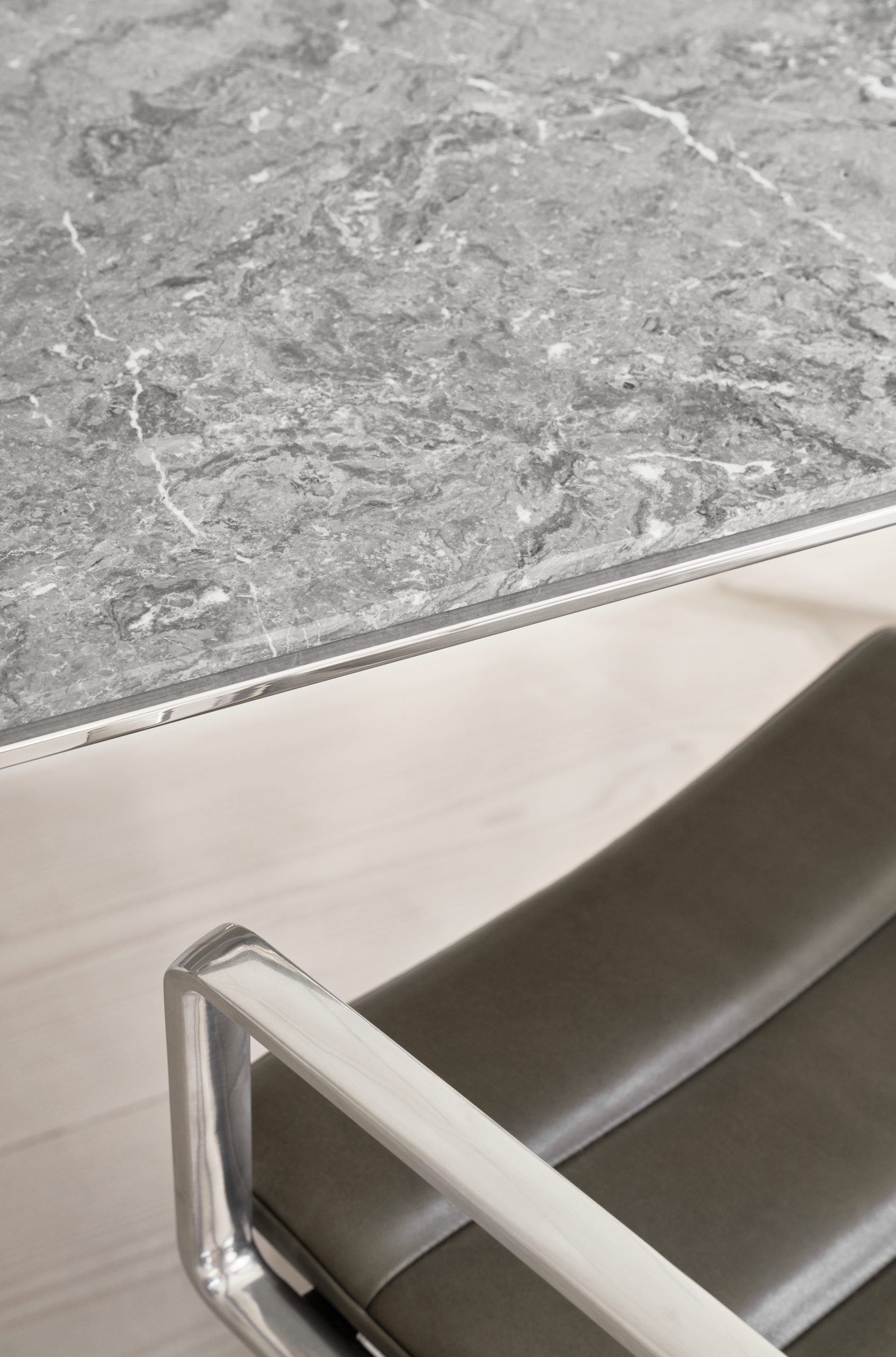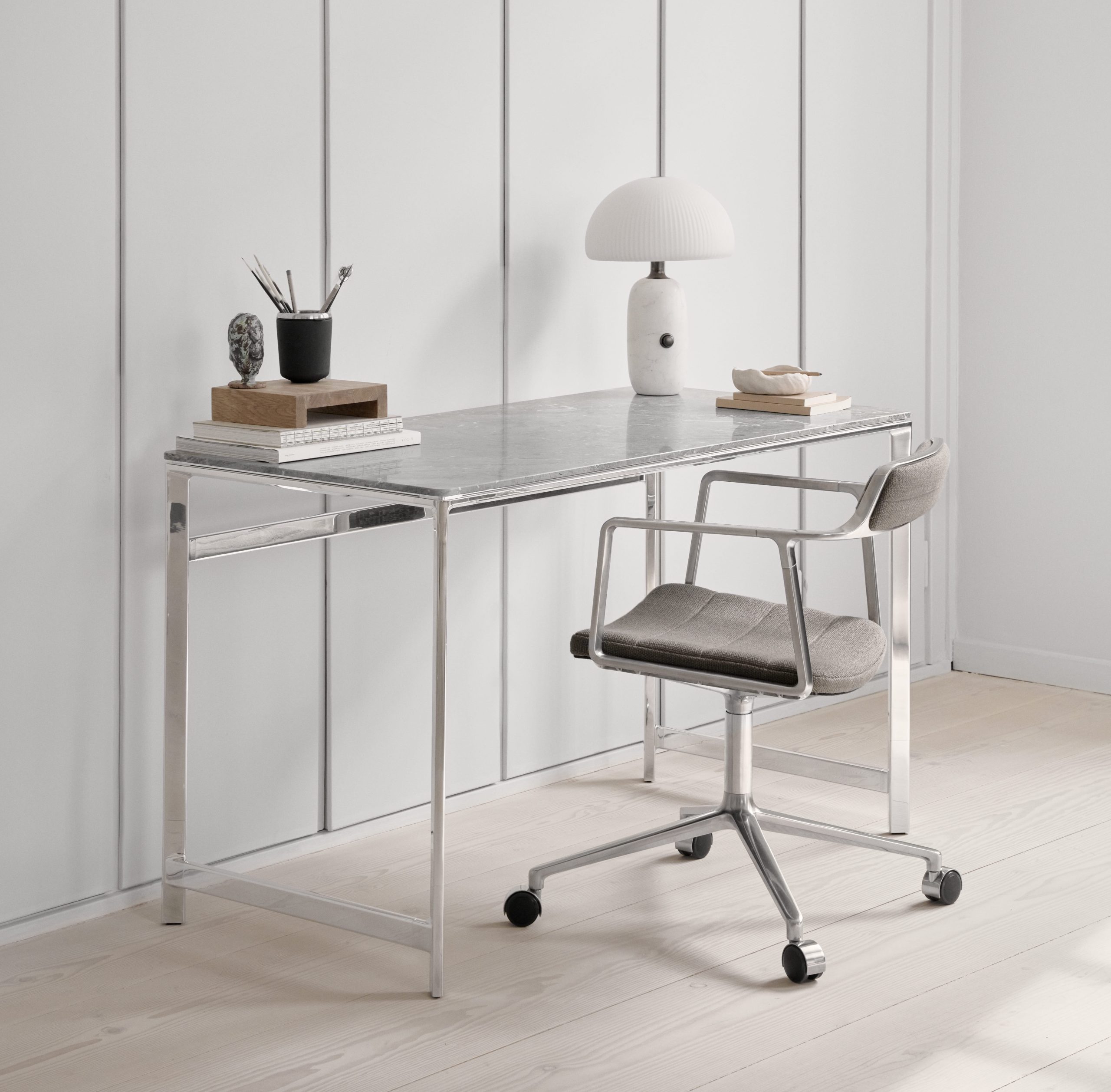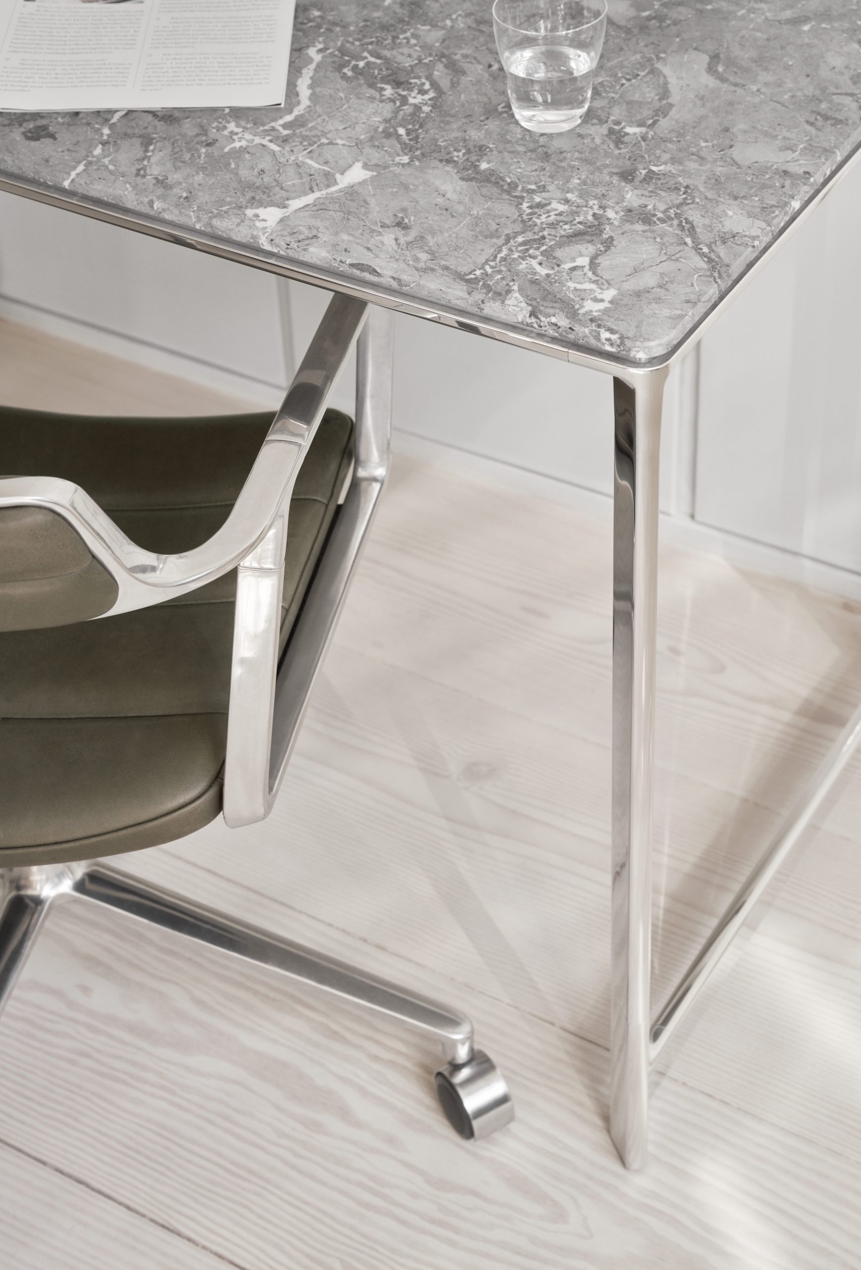 Skrivebordets polerede aluminiumsstel og samlinger matcher dem, der findes på Vipp’s Swivel-stol, hvilket skaber et helstøbt og harmonisk udtryk, når stolen skubbes ind under bordet.