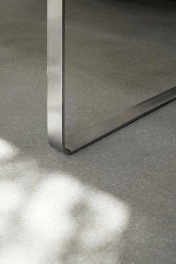 Bordets stel består af to benbukke i bukket fladstål, der er forbundet af tværgående stålsarger, som både understøtter konstruktionen og skaber et luftigt udtryk. De afrundede hjørner på glaspladen og stellets bløde buk bidrager til, at bordet fremstår harmonisk trods sine hårde materialer.