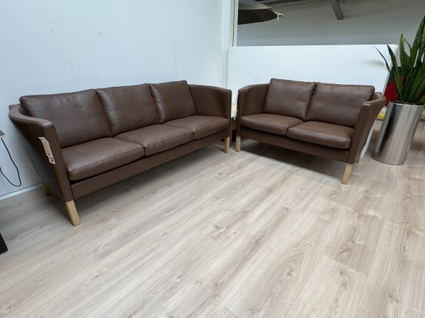 Elegant og klassisk sofasæt designet af Arne Vodder for Nielaus – model AV59. Sættet består af en 3-personers og en 2-personers sofa, begge betrukket med det eksklusive Derby-læder i brun, som kombinerer holdbarhed med blød komfort og et varmt, indbydende udtryk.