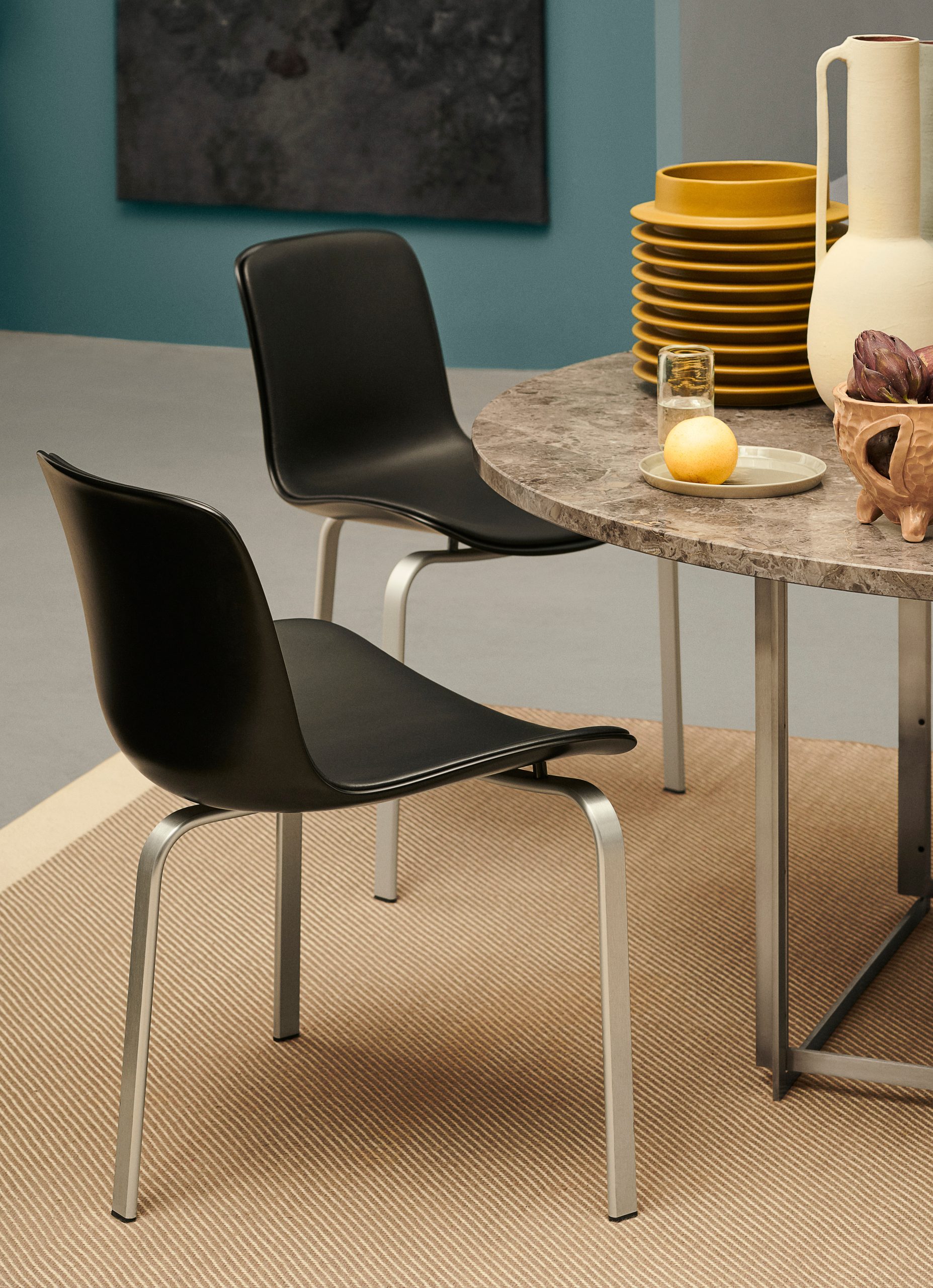 PK54™ spisebordet fra Fritz Hansen, designet af Poul Kjærholm, er en harmonisk blanding af kontraster, både i form og materialevalg. Den runde bordplade står i kontrast til det kvadratiske stel, mens kombinationen af stål og marmor skaber en spændende æstetisk dynamik. Denne sammensætning gør PK54™ til et imponerende midtpunkt i ethvert rum.