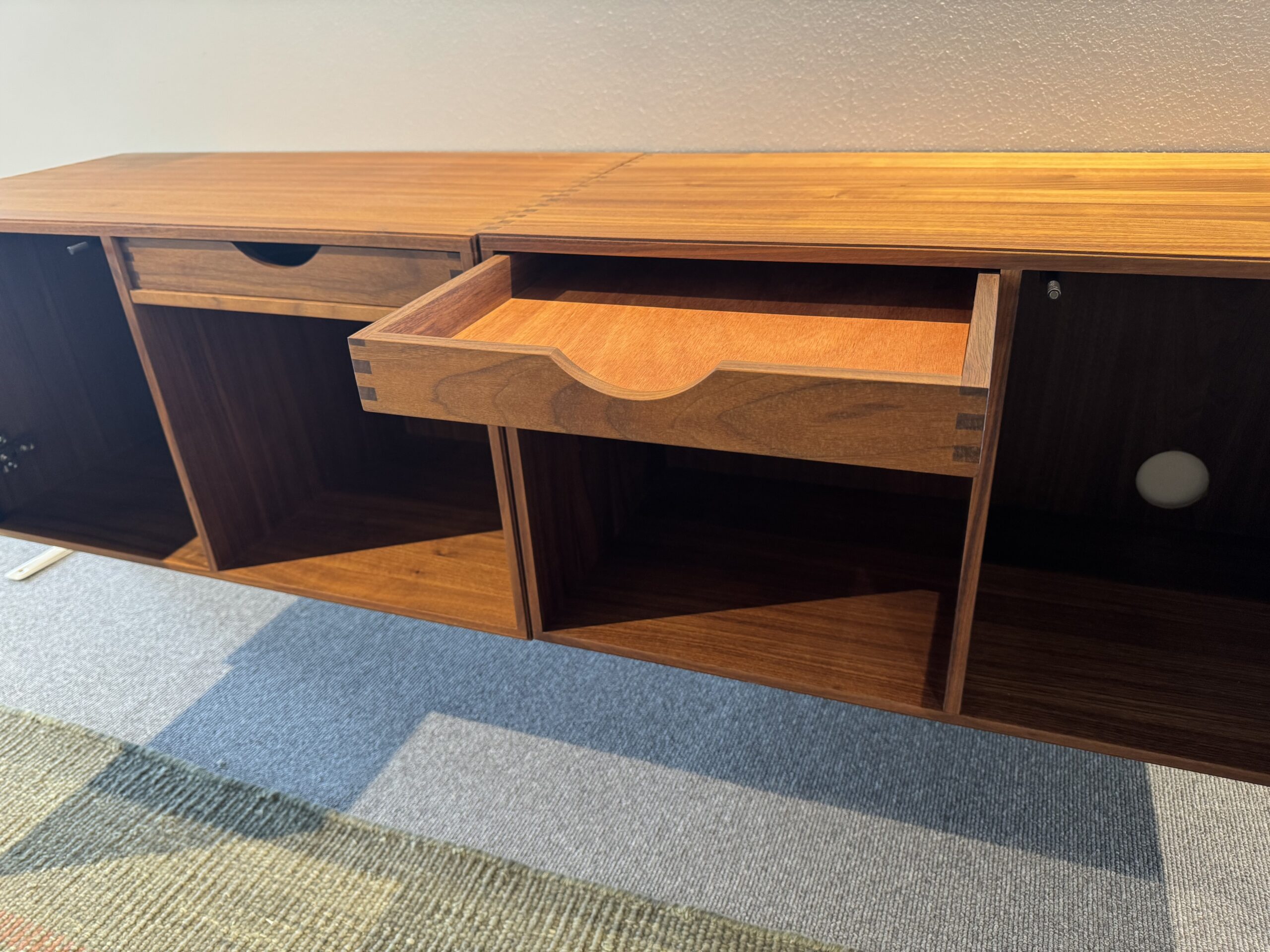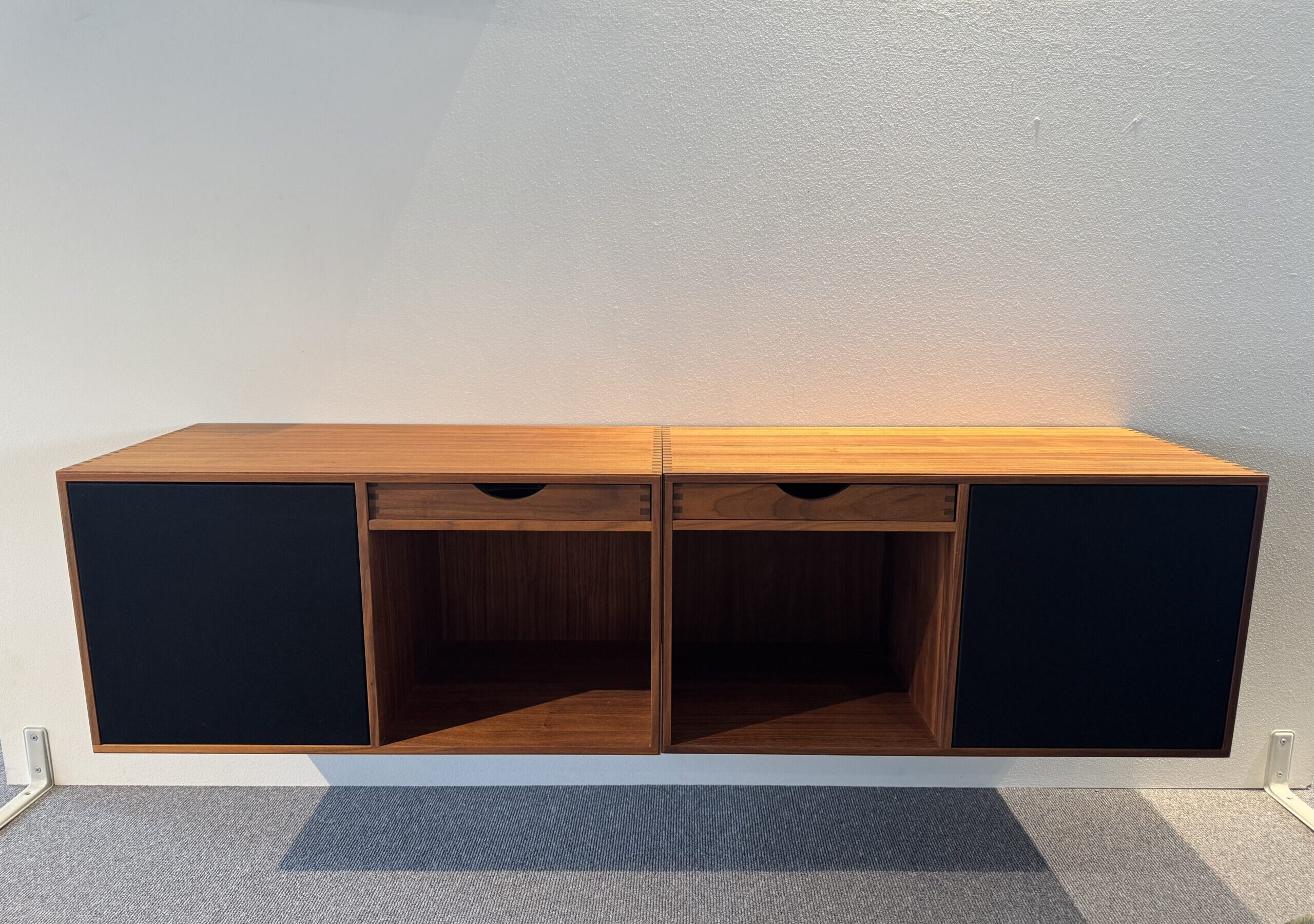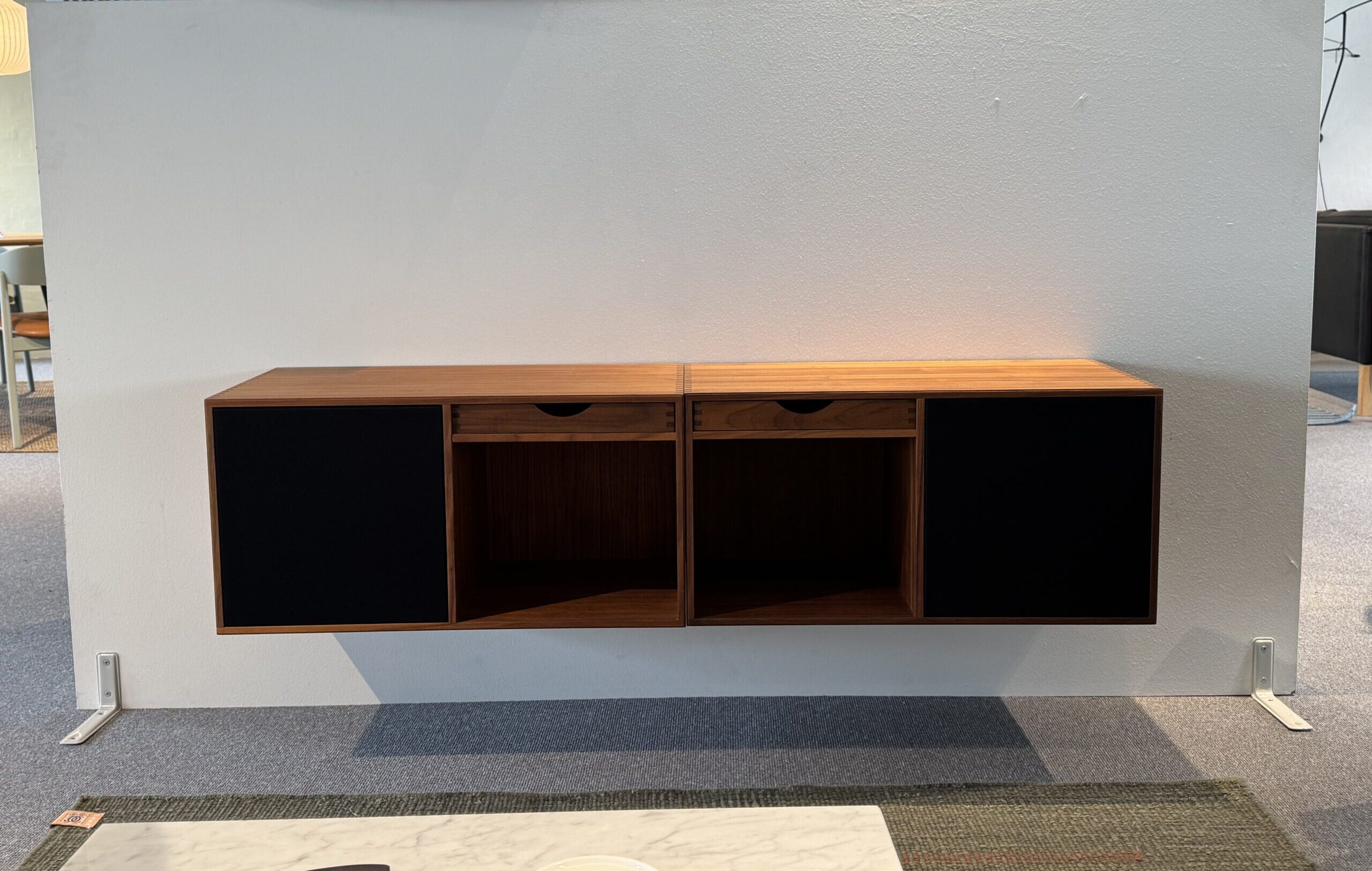 Flot og eksklusiv TV-reol fra ATBO, udført i massiv olieret valnød, der fremhæver træets naturlige spil og varme tone. Reolen består af to moduler med ophængsbeslag, som giver et let og svævende udtryk – ideelt til en moderne og stilren indretning.